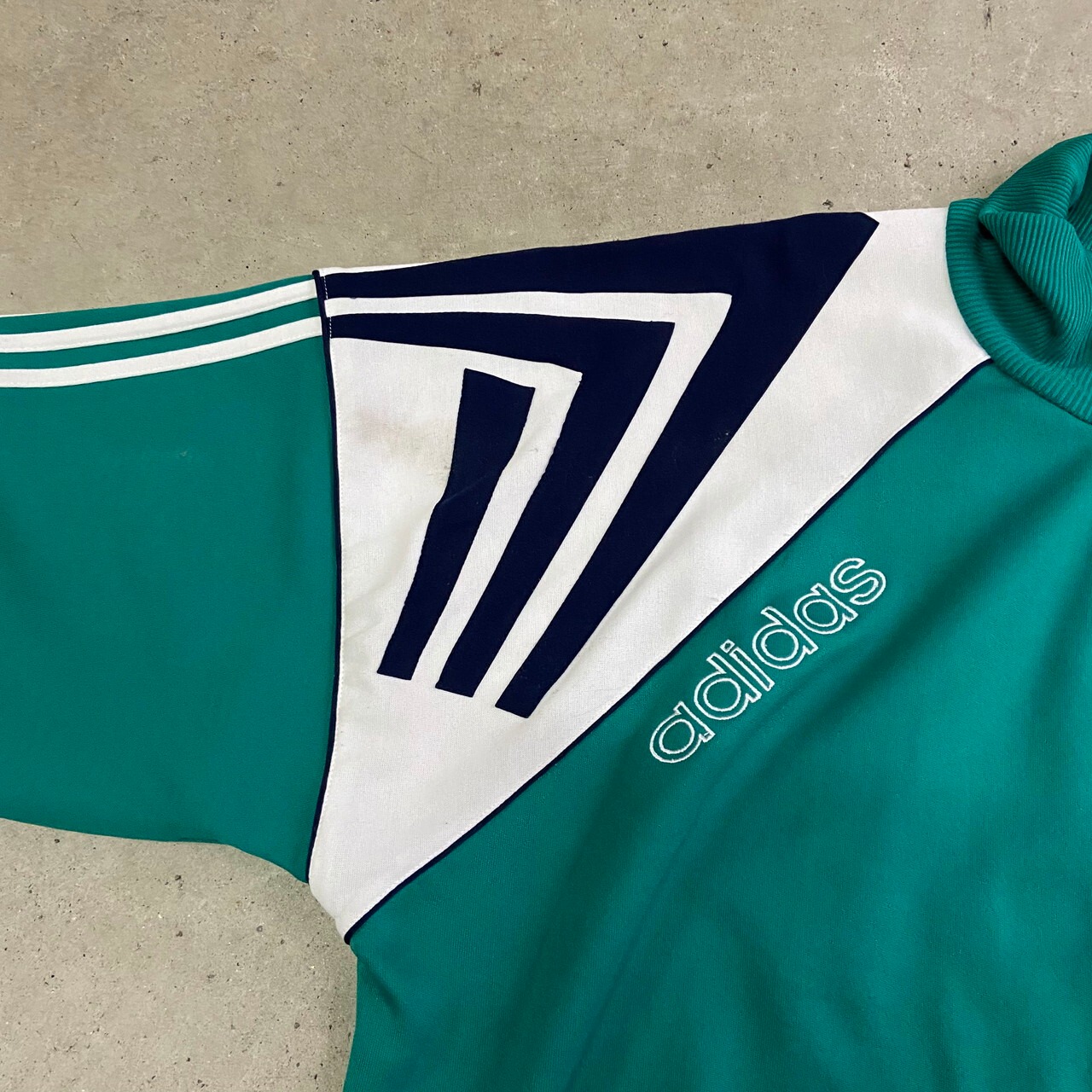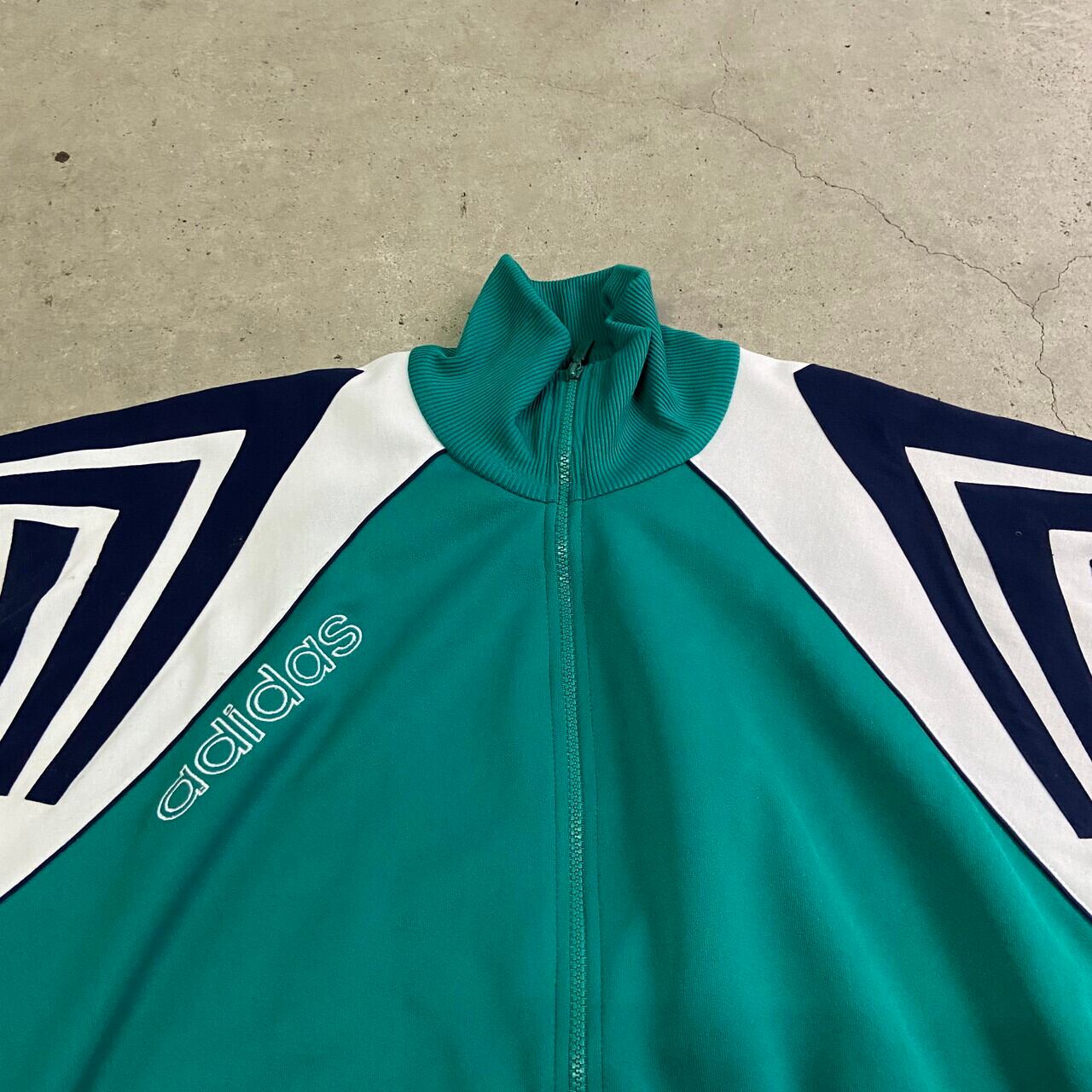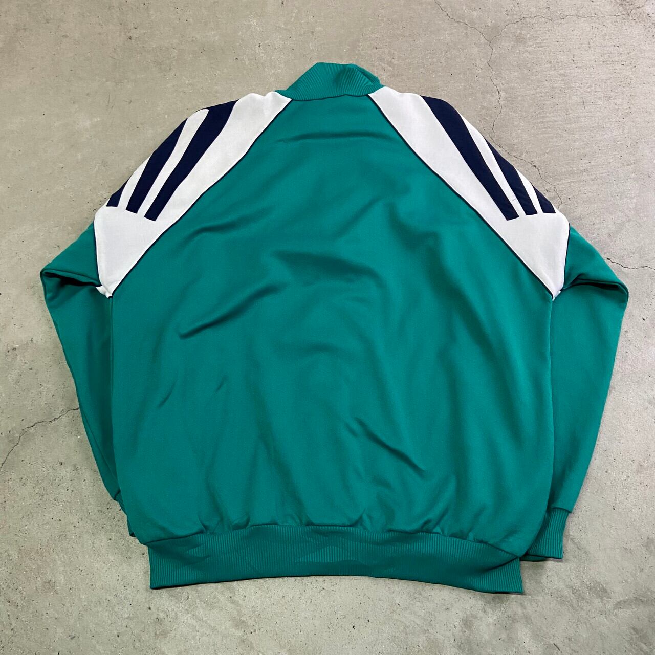 80〜90年代 adidas アディダストラックジャケット メンズ2XL相当 古着 切替 ジャージ 80s 90s ビンテージ ヴィンテージ ハイネック サイドライン エメラルドグリーン ネイビー ホワイト 緑色 紺色 白 【ジャージ・トラックジャケット】【WS2202-15】
