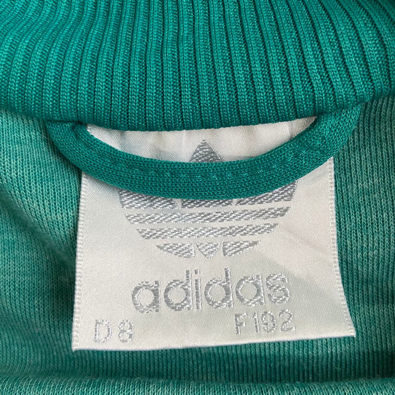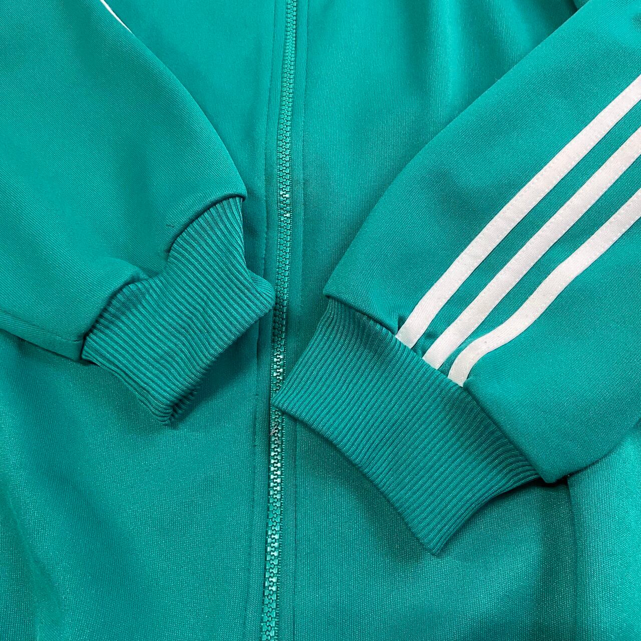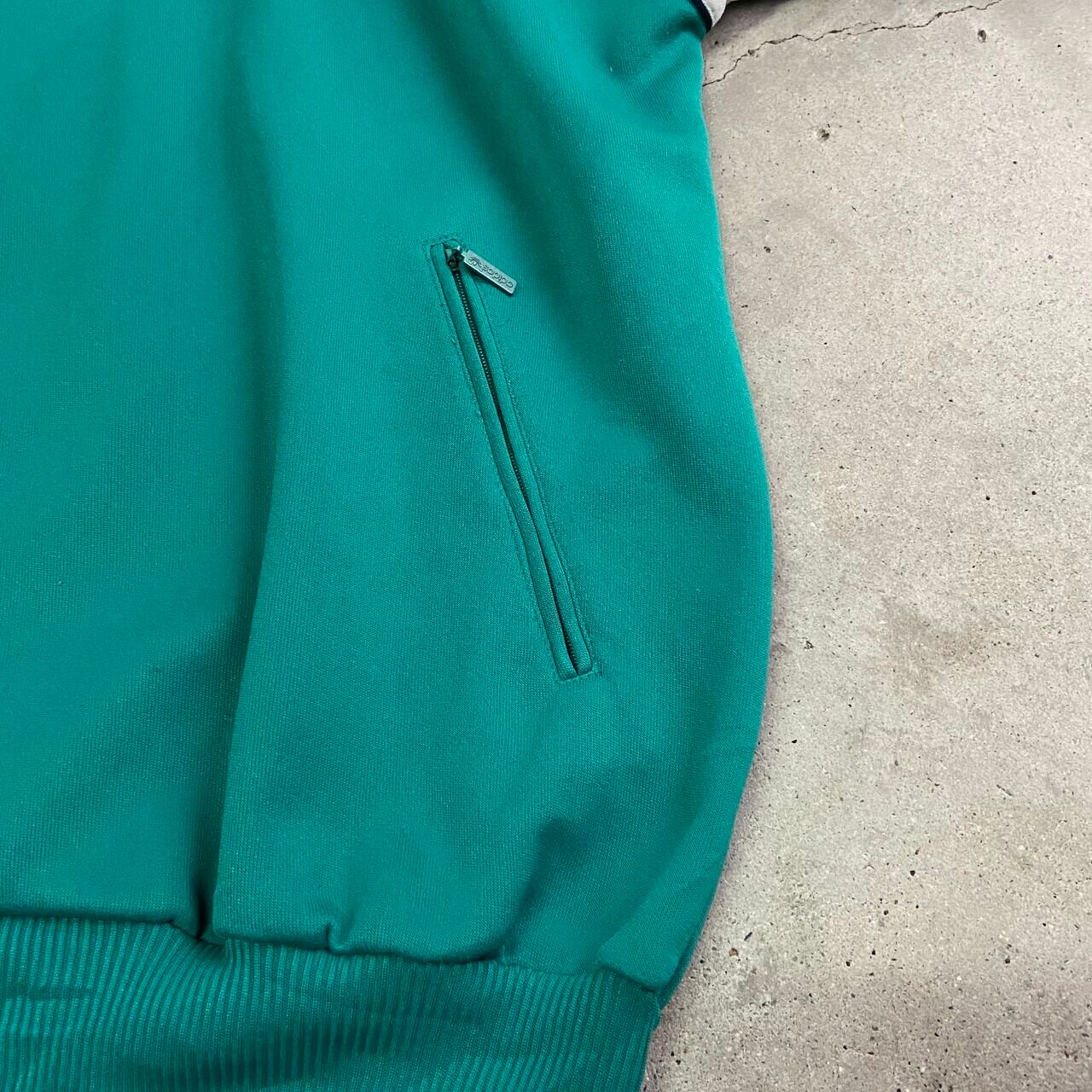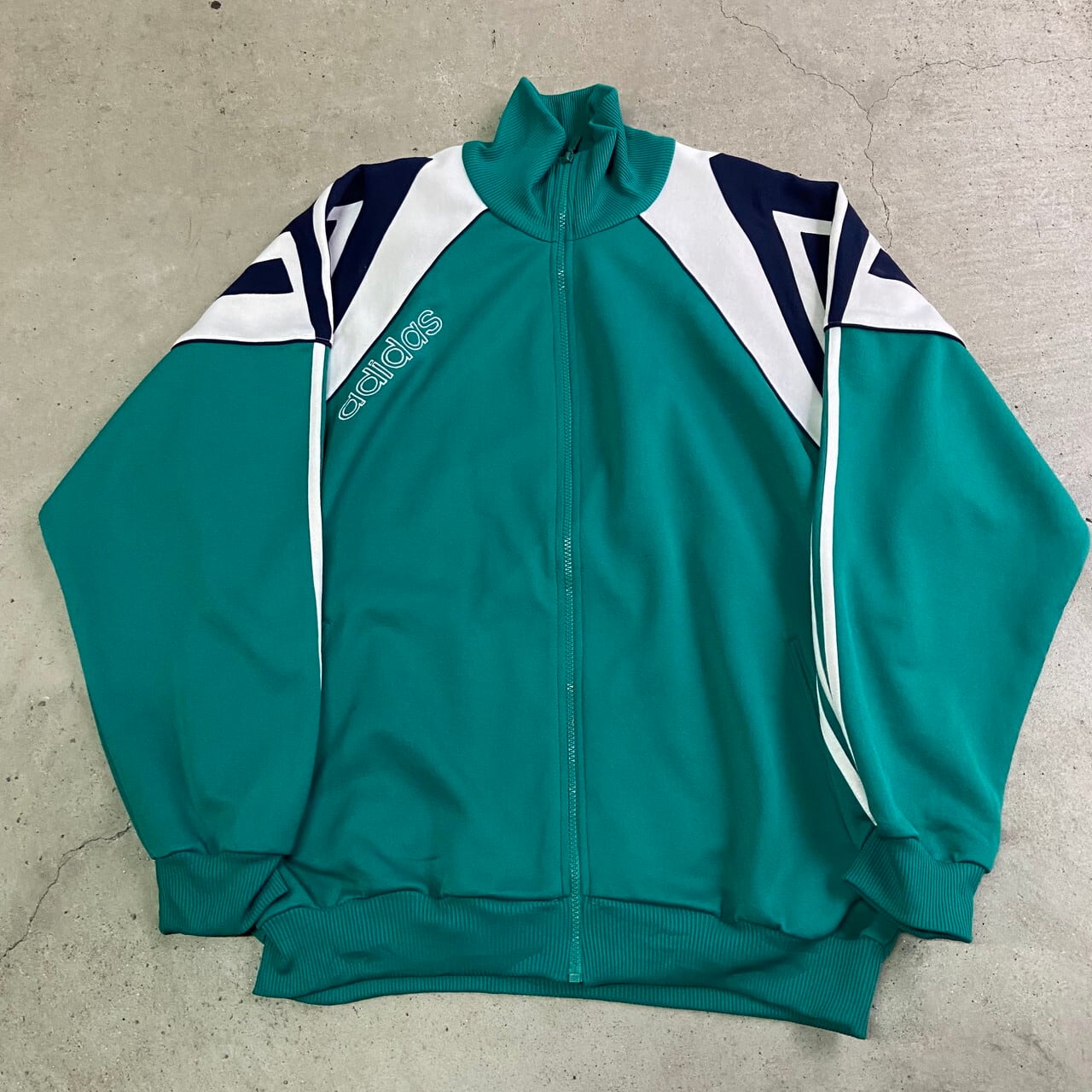 80〜90年代 adidas アディダストラックジャケット メンズ2XL相当 古着 切替 ジャージ 80s 90s ビンテージ ヴィンテージ ハイネック サイドライン エメラルドグリーン ネイビー ホワイト 緑色 紺色 白 【ジャージ・トラックジャケット】【WS2202-15】