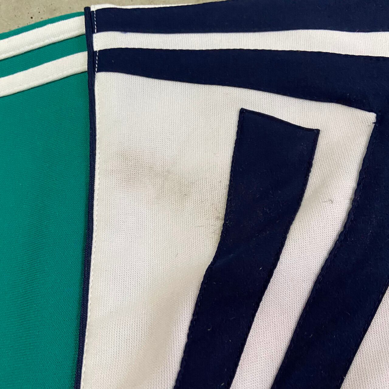 ■80〜90年代 adidas アディダストラックジャケット メンズ2XL相当 古着 切替 ジャージ 80s 90s ビンテージ ヴィンテージ ハイネック サイドライン エメラルドグリーン ネイビー ホワイト 緑色 紺色 白 【ジャージ・トラックジャケット】
