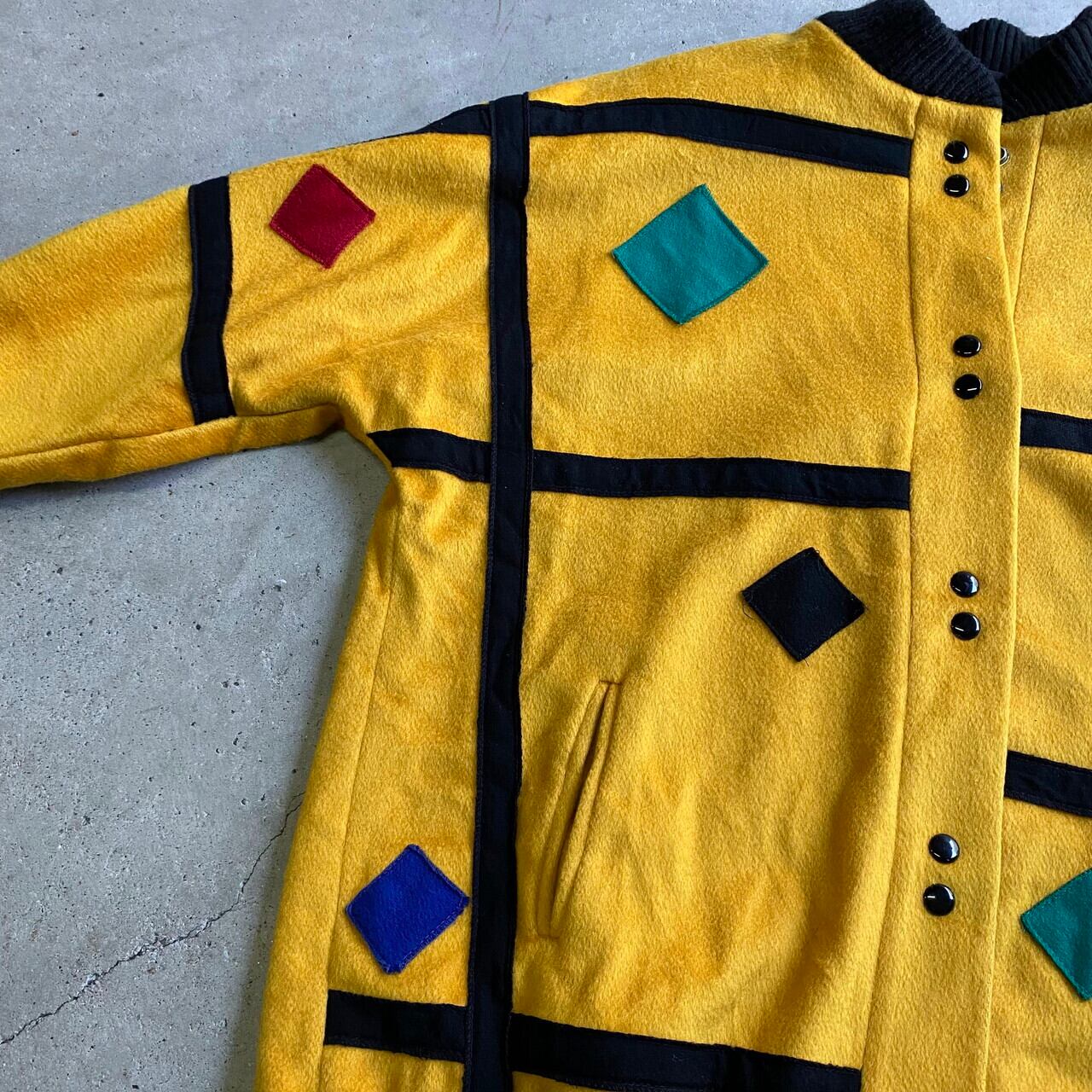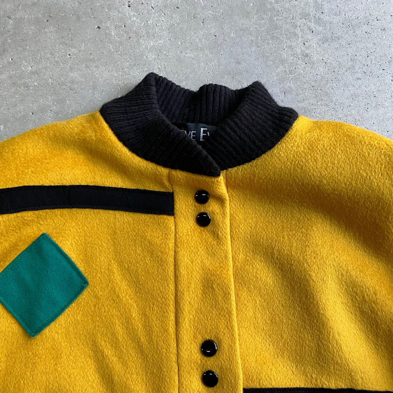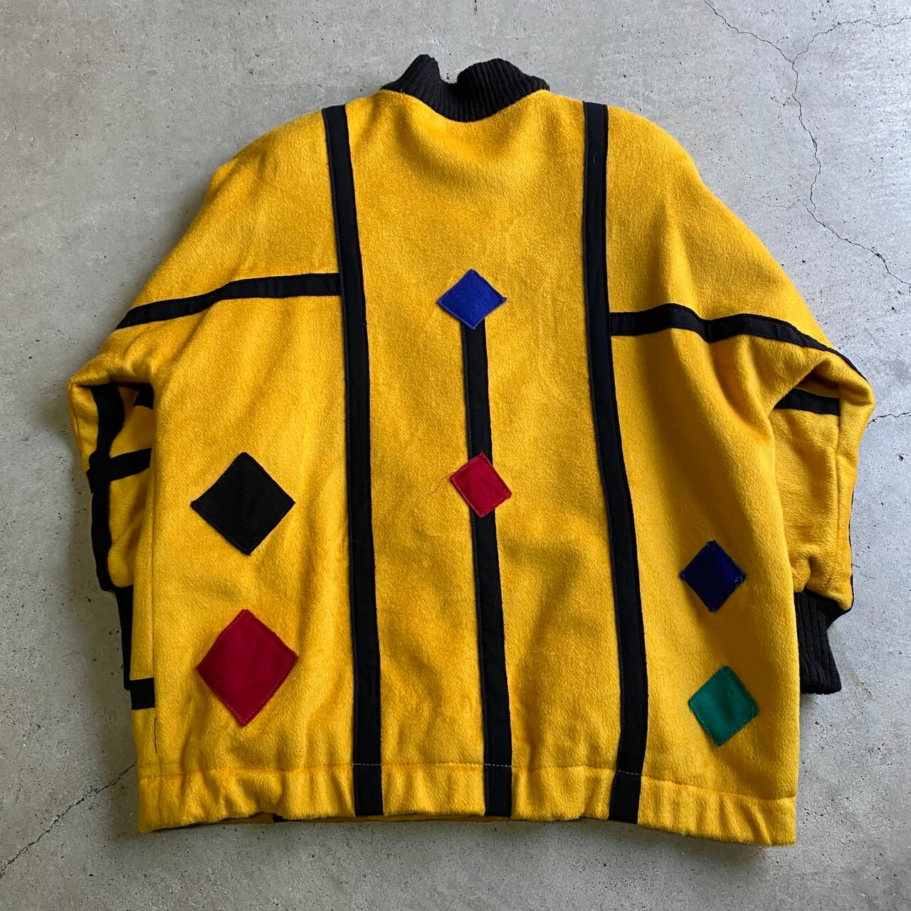 80年代 USA製 STEVE EVANS 幾何学柄 パッチワークデザイン ドルマンスリーブ ウールジャケット ブルゾン レディースL-XL相当 メンズM-L相当 古着 ヴィンテージ ビンテージ 肩パッド入り 80s イエロー 黄色【ブルゾン・ジャケット】