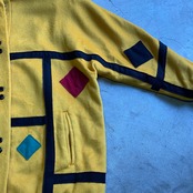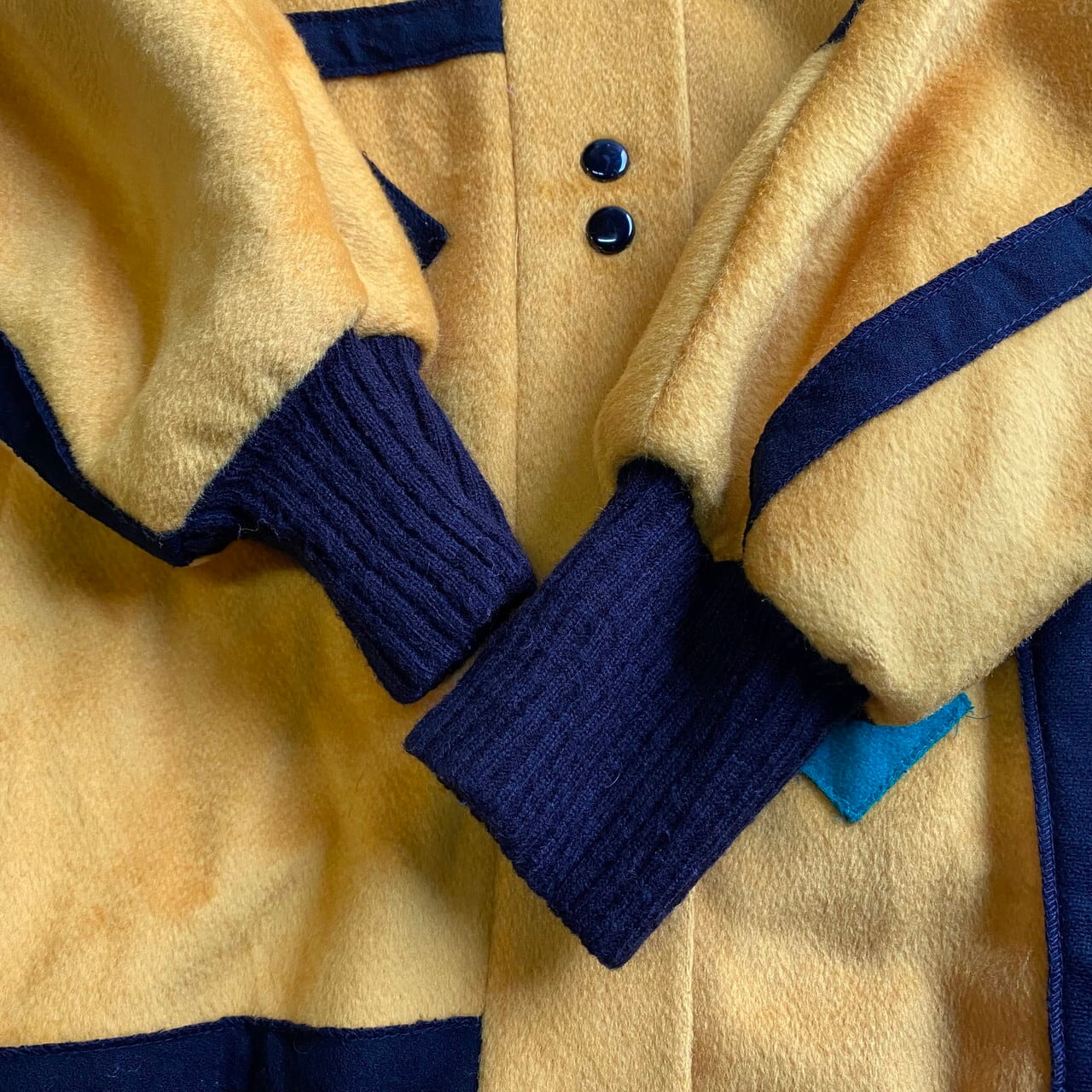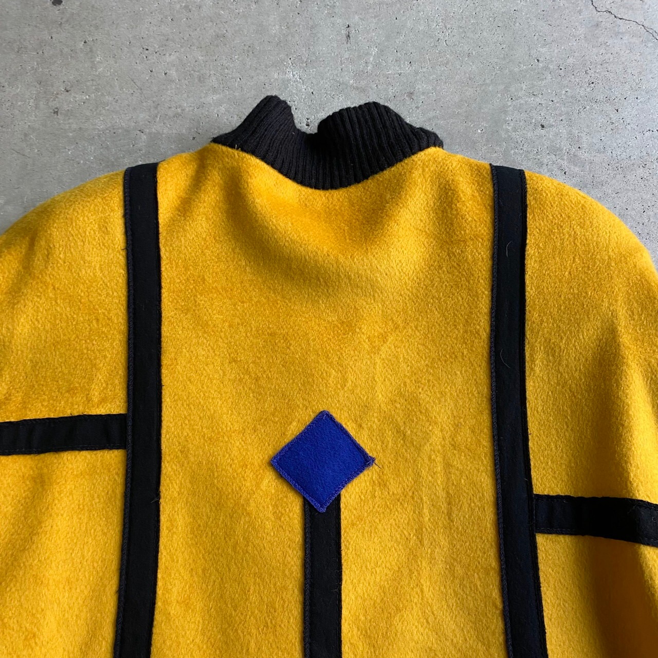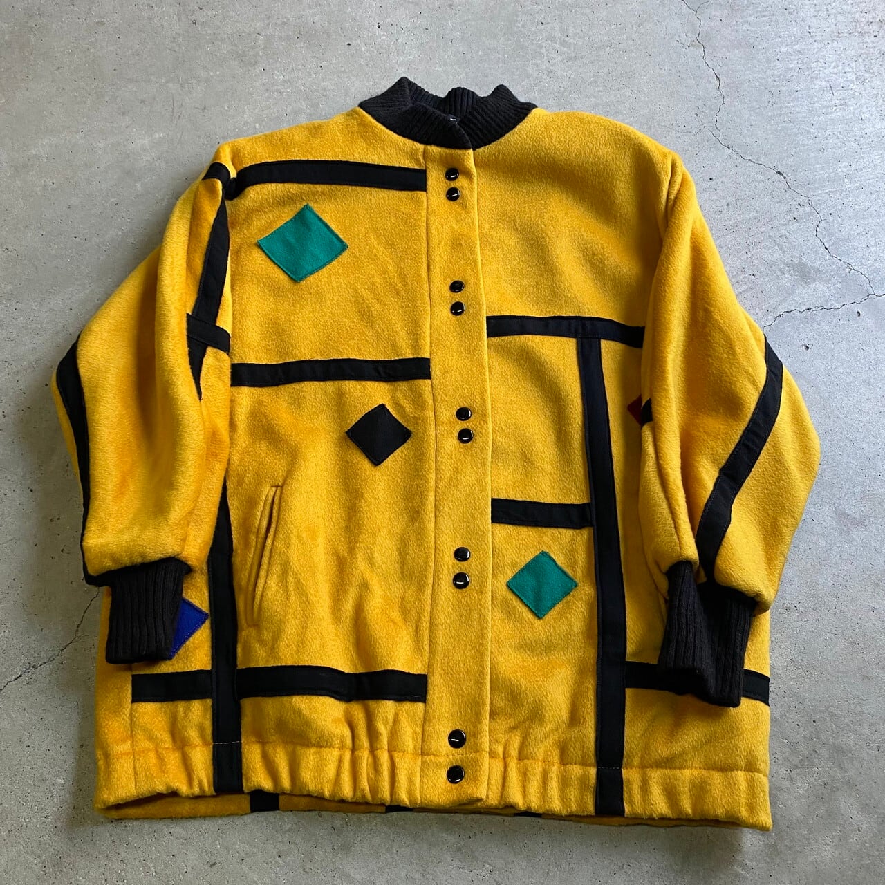 80年代 USA製 STEVE EVANS 幾何学柄 パッチワークデザイン ドルマンスリーブ ウールジャケット ブルゾン レディースL-XL相当 メンズM-L相当 古着 ヴィンテージ ビンテージ 肩パッド入り 80s イエロー 黄色【ブルゾン・ジャケット】