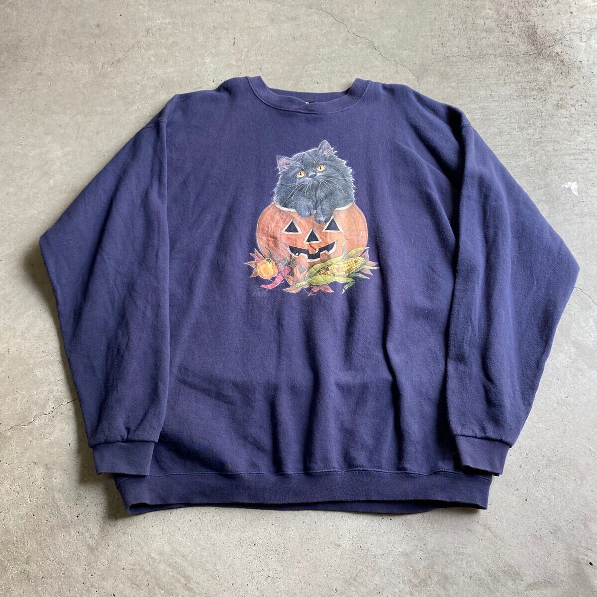 ■ビッグサイズ 90年代 STARTER スターター ネコ×ハロウィン プリント スウェット メンズXXL相当 古着 大きいサイズ 90s ヴィンテージ ビンテージ プルオーバー トレーナー ネイビー 紺色 【トレーナー】