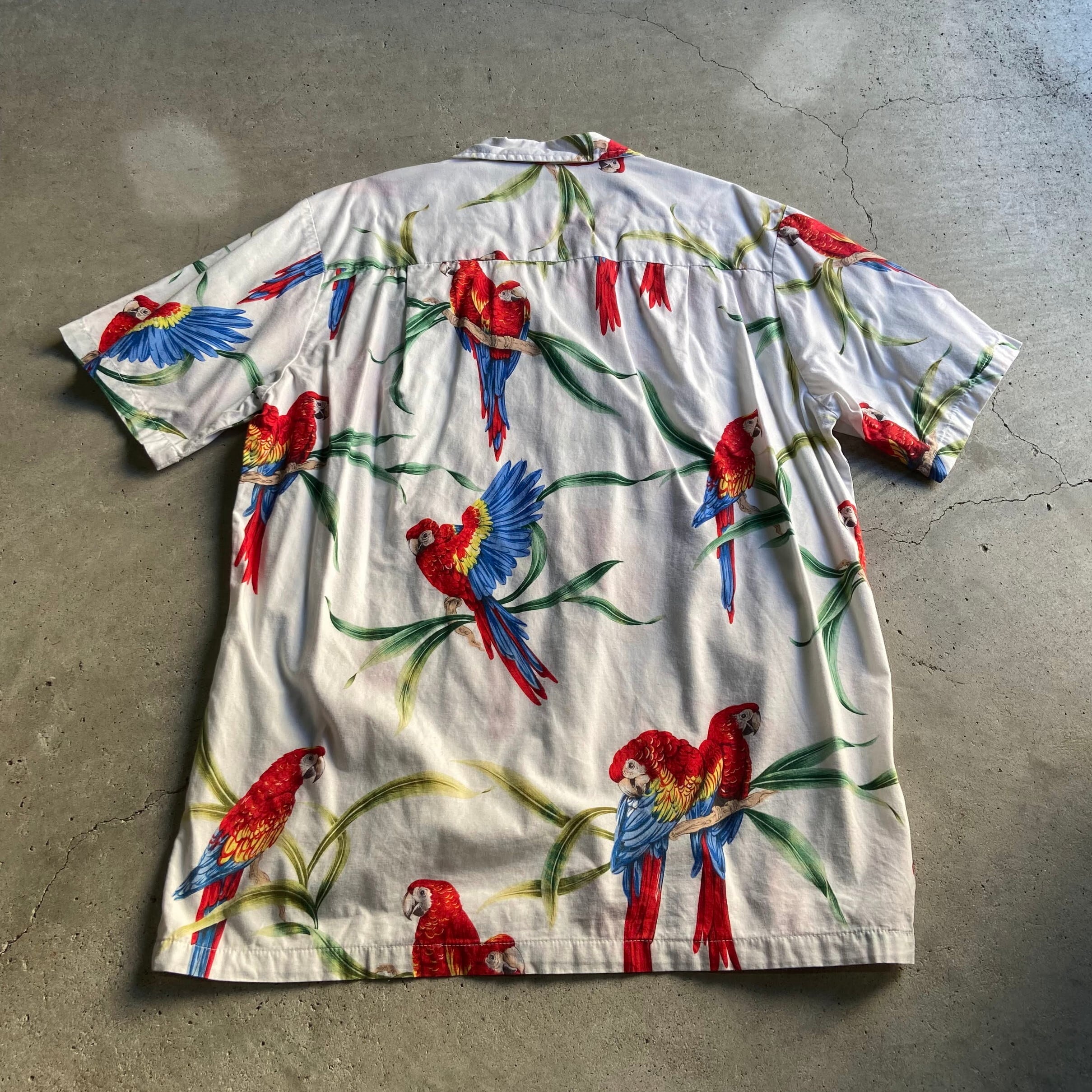 USA ハワイ製 90年代 ヴィンテージ paradise found 半袖 開襟 オウム 鳥 総柄 ハワイアン アロハシャツ メンズL 古着 ホワイト 白 アニマル 90s ビンテージ オープンカラー【半袖シャツ】
