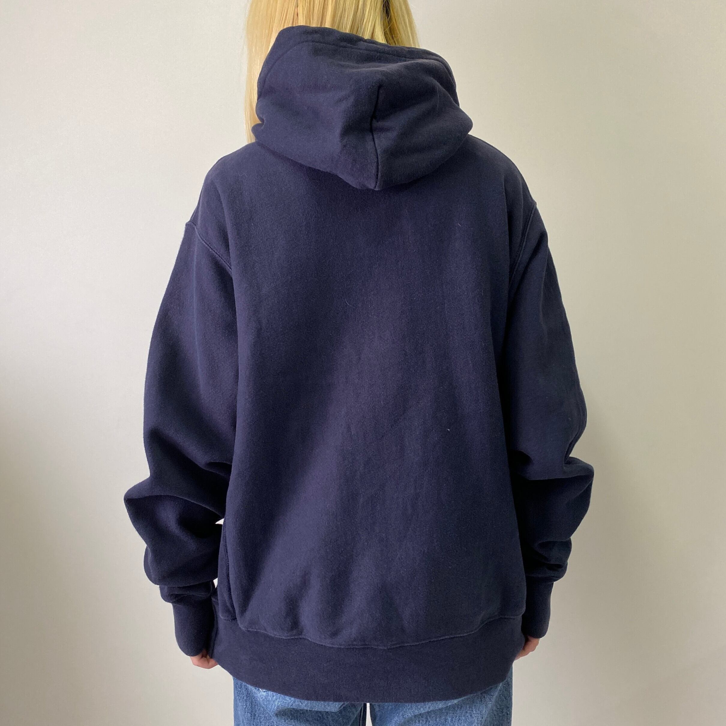 Champion チャンピオン 青タグ 復刻 ロゴ ワッペン リバースウィーブ スウェットパーカー メンズXL 古着 REVERSE WEAVE ネイビー 紺色【パーカー】【autumn22】