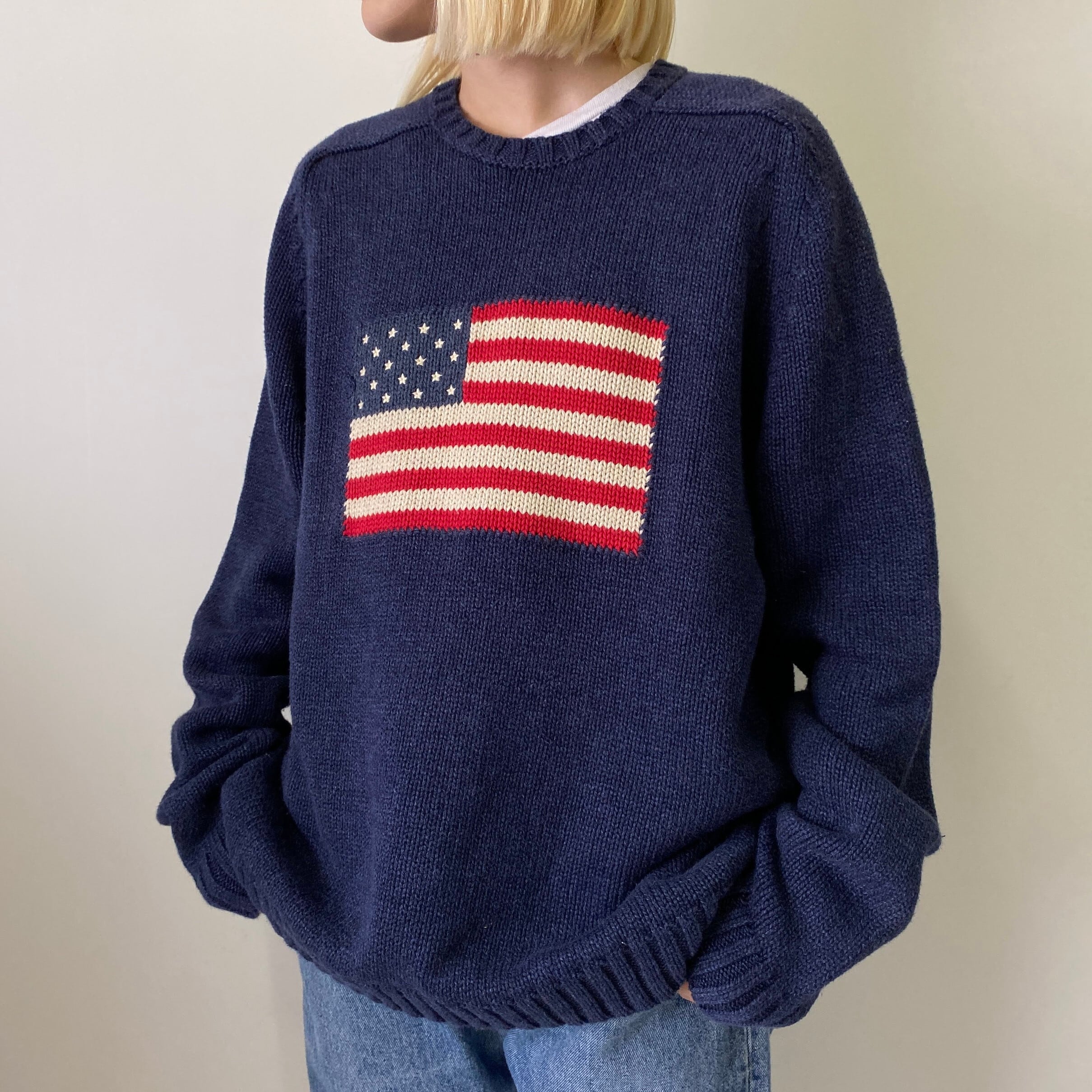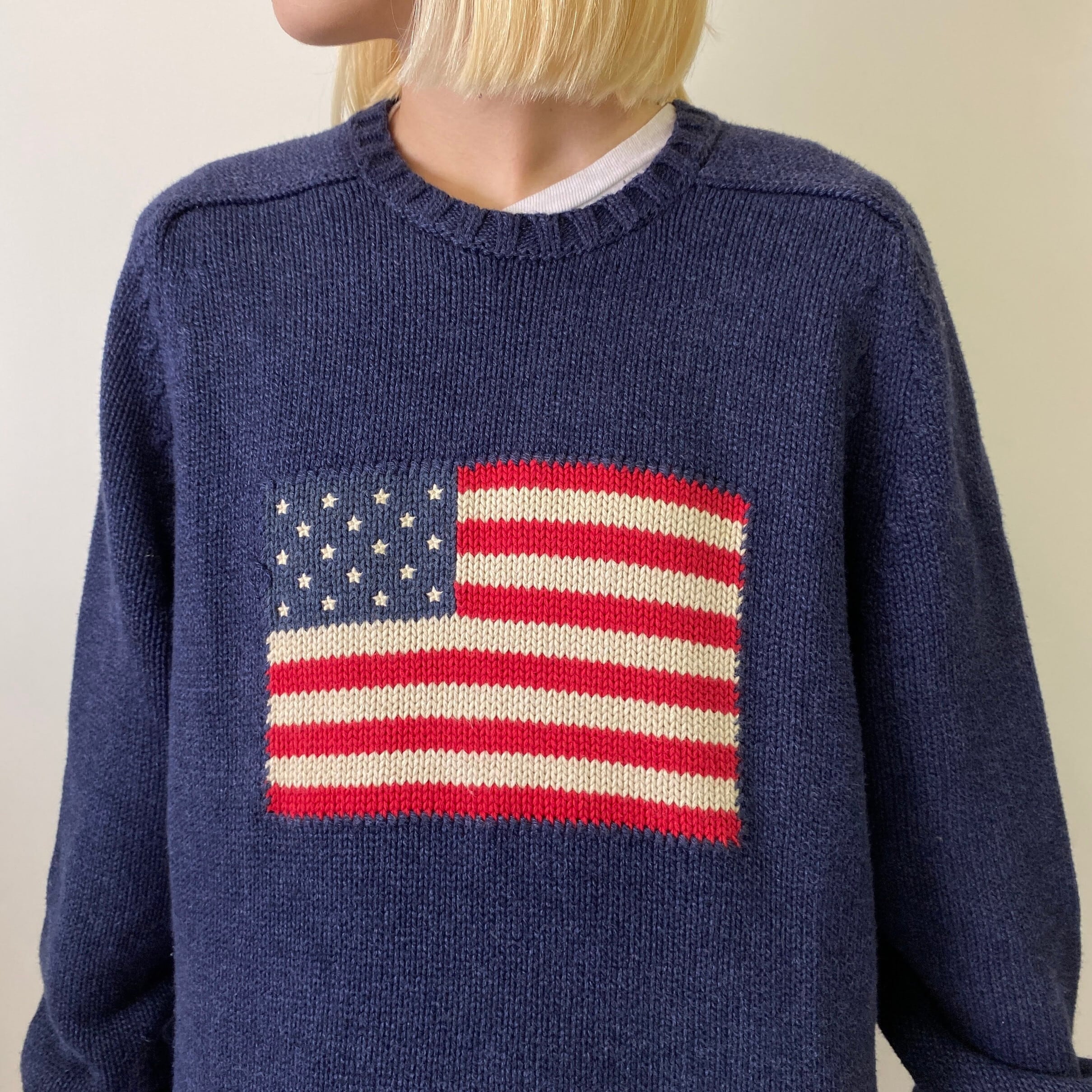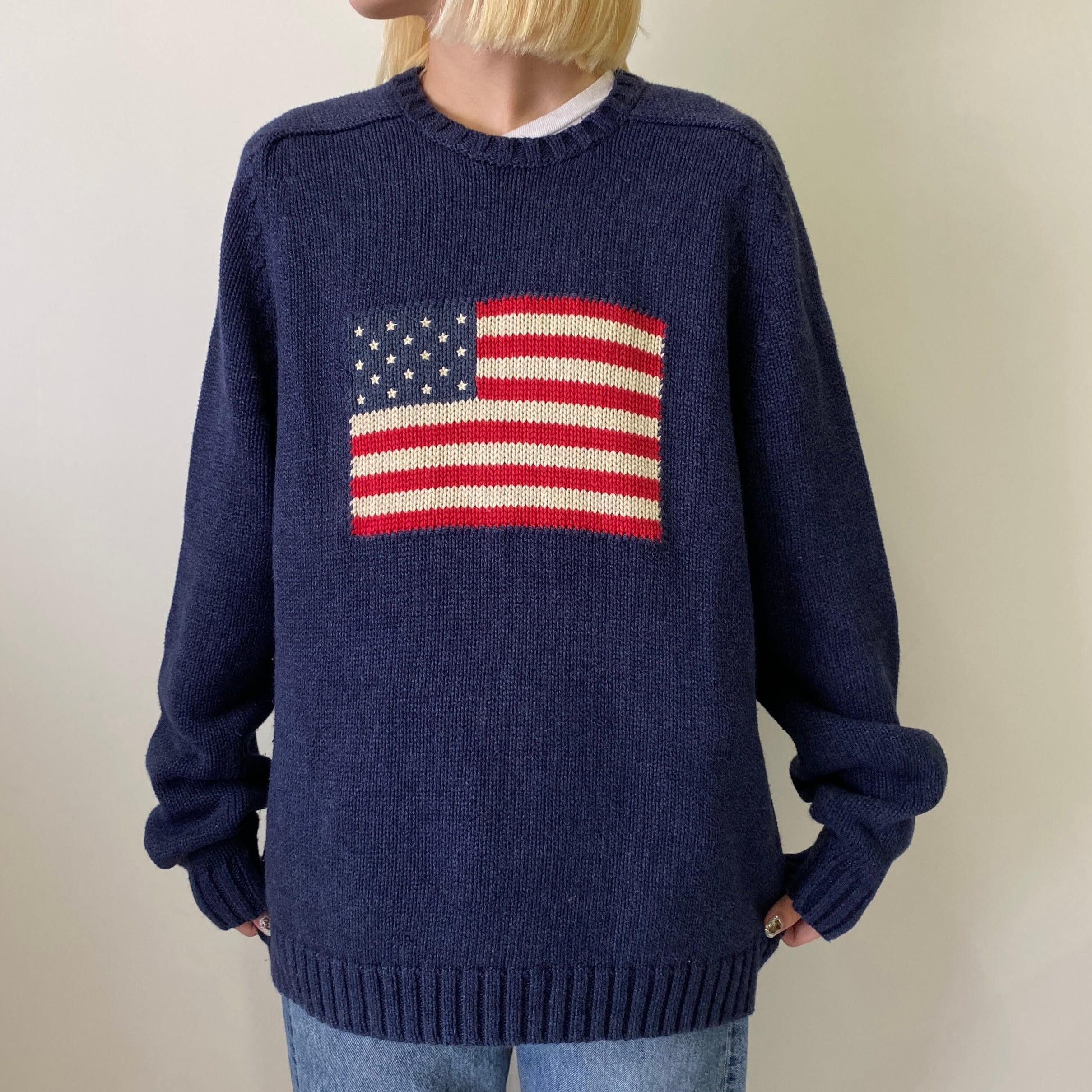 ■LANDS' END ランズエンド アメリカ 国旗 星条旗柄 コットンニットセーター メンズXL相当 古着 ネイビー 紺色【ニットセーター】