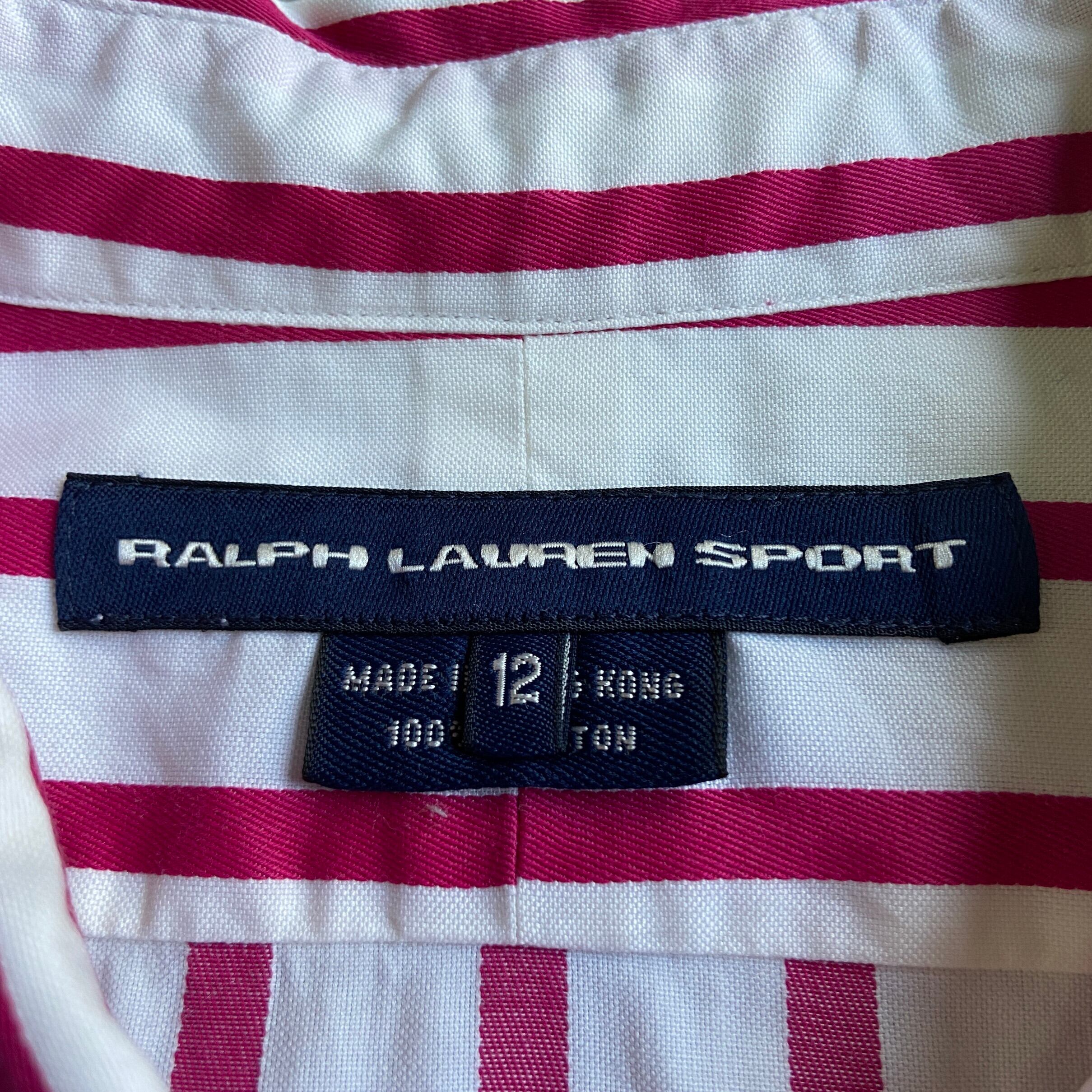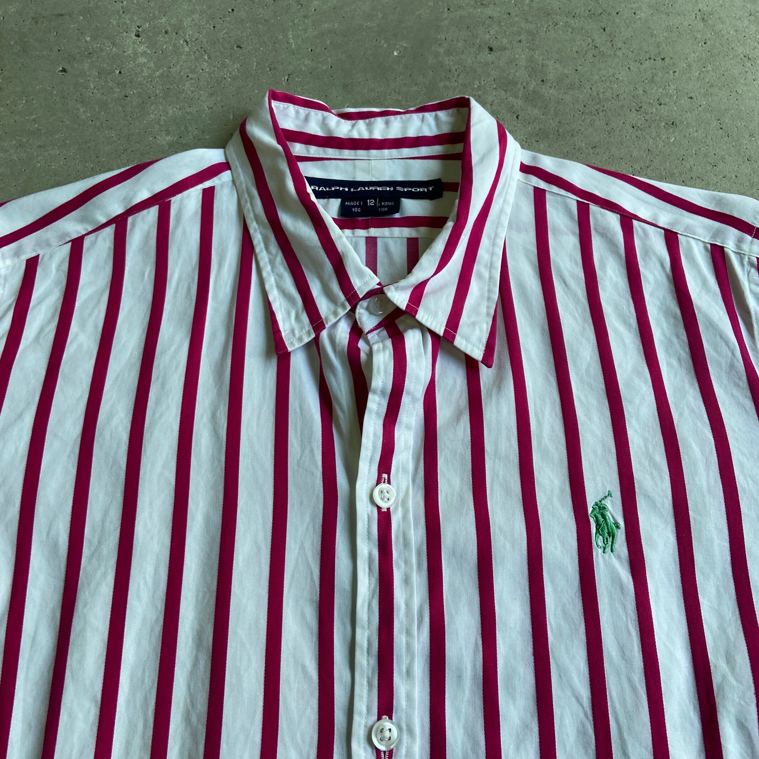 ■Ralph Lauren SPORT ラルフローレン 長袖 ストライプシャツ レディースL相当 古着 ボタンダウンシャツ B.Dシャツ ショッキングピンク×ホワイト 白色【長袖シャツ】