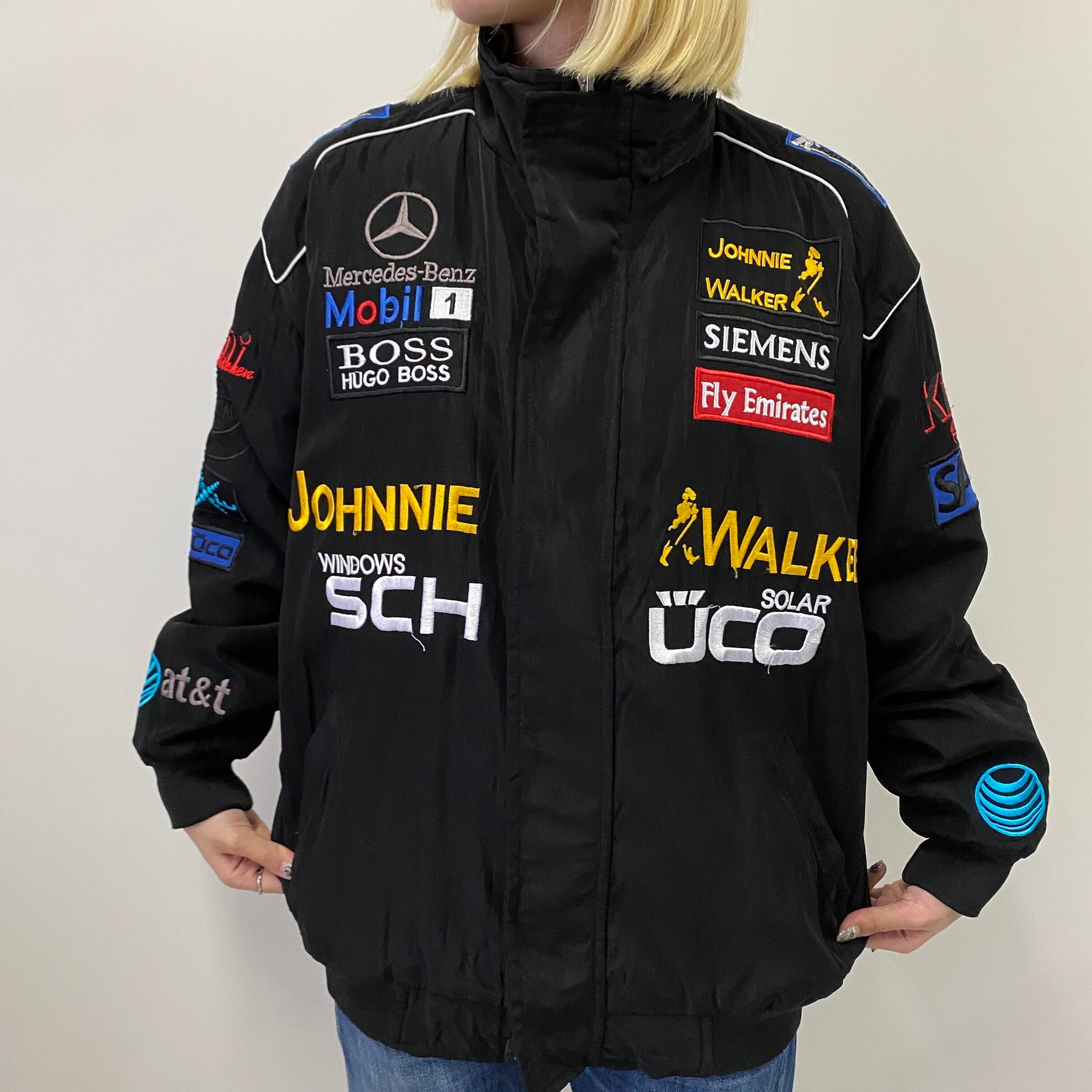 メルセデスベンツ Mercedes-Benz 企業ロゴ 刺繍 ワッペン レーシングジャケット 中綿ブルゾン メンズL相当 古着 ブラック 黒【レーシングジャケット】