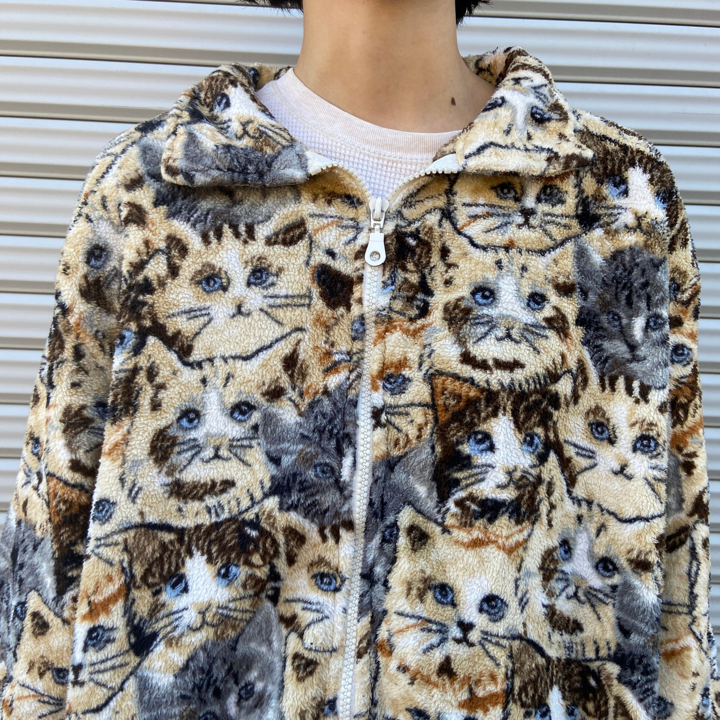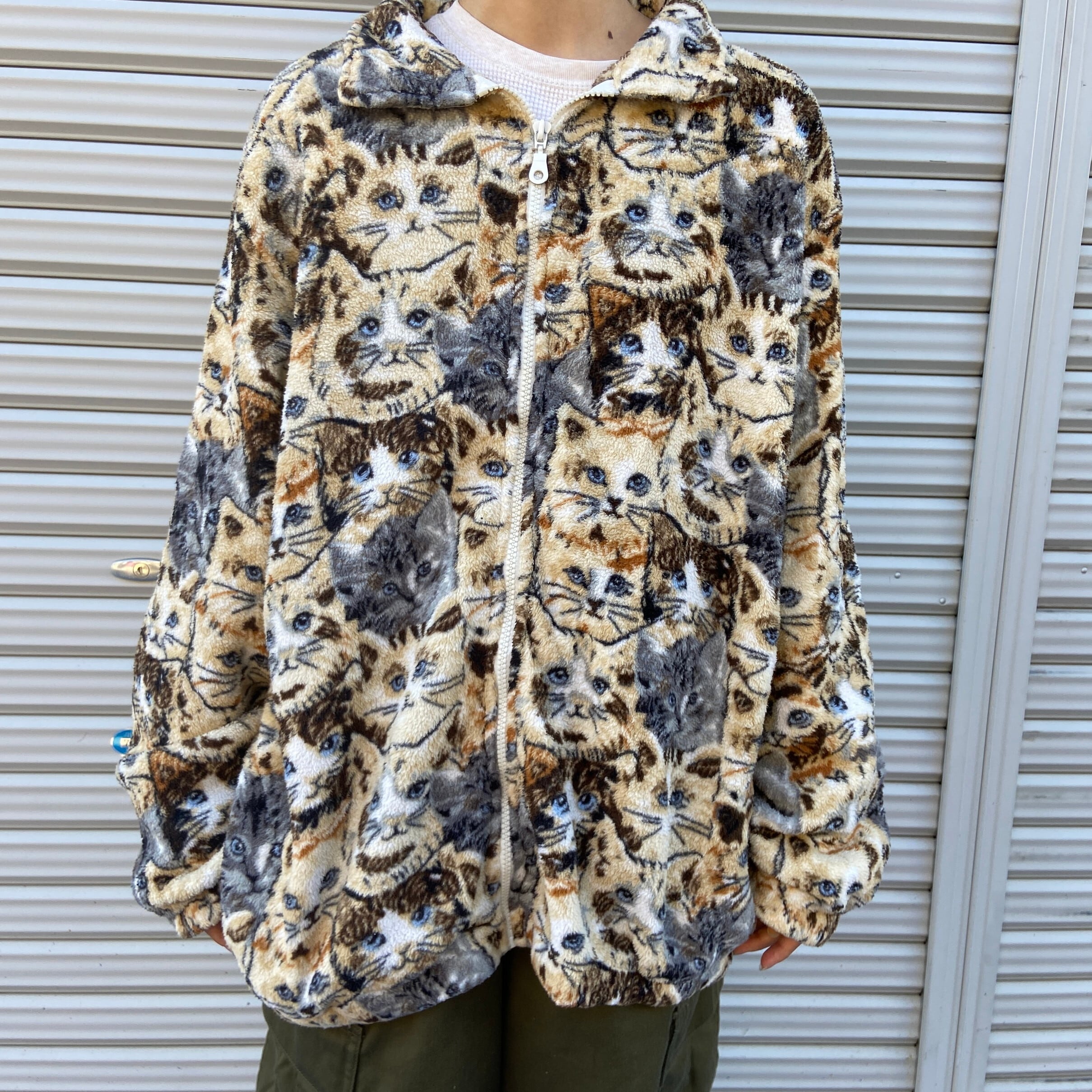 ■90年代 BonWorth 猫 アニマルフリースジャケット ブラウン 茶色 レディースL 古着 90s 総柄 ヴィンテージ ビンテージ ブルゾン【フリースジャケット】