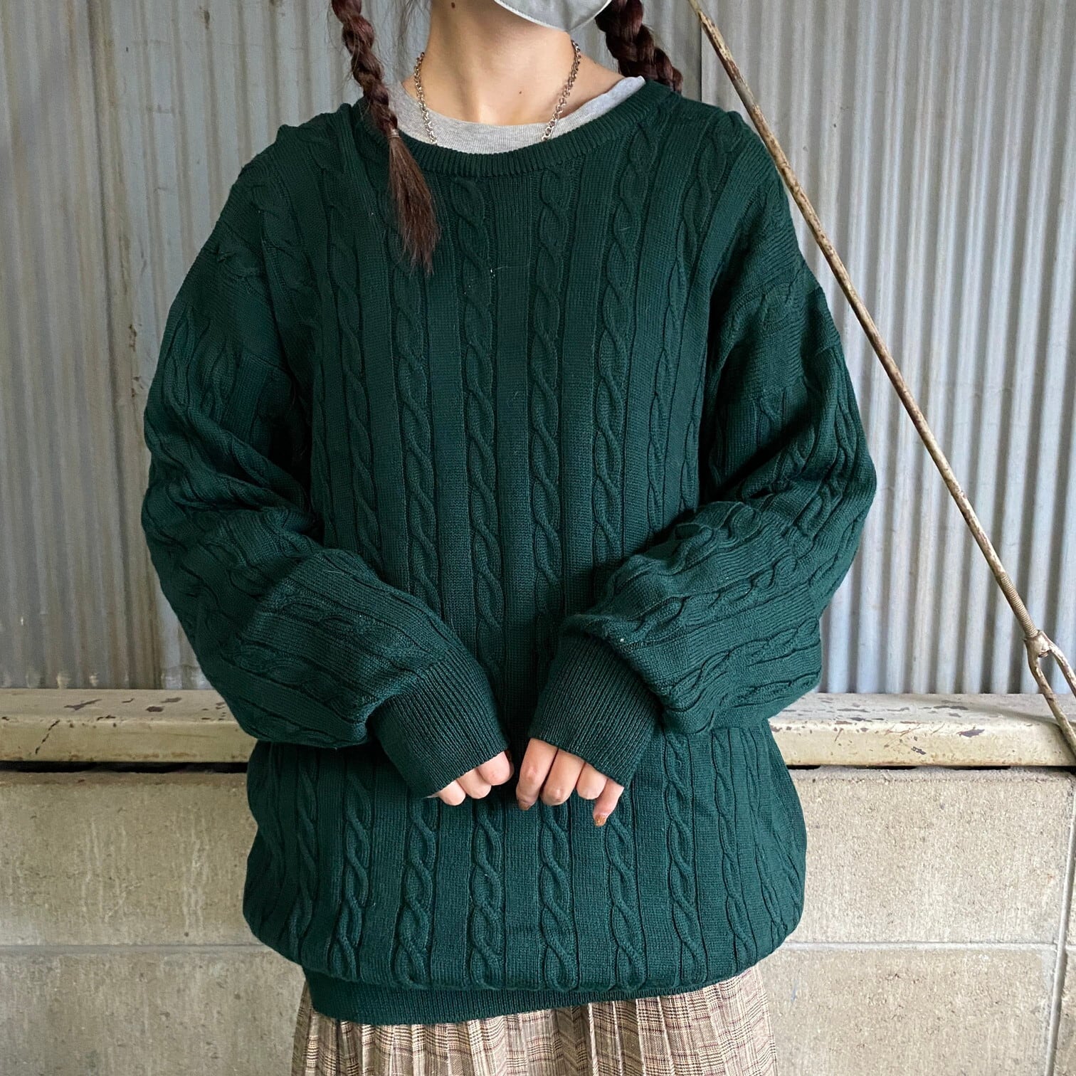 スコットランド製 80年代 Pringle プリングル ラムズウール ニットセーター メンズXL相当 古着 ケーブル編み ヴィンテージ 80s ビンテージ グリーン 緑色 【ニットセーター】【SS2401-30】