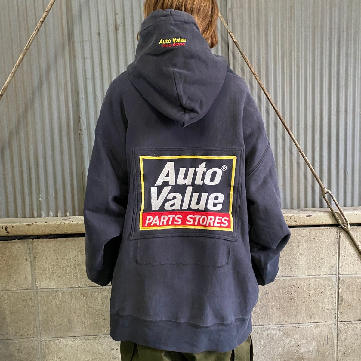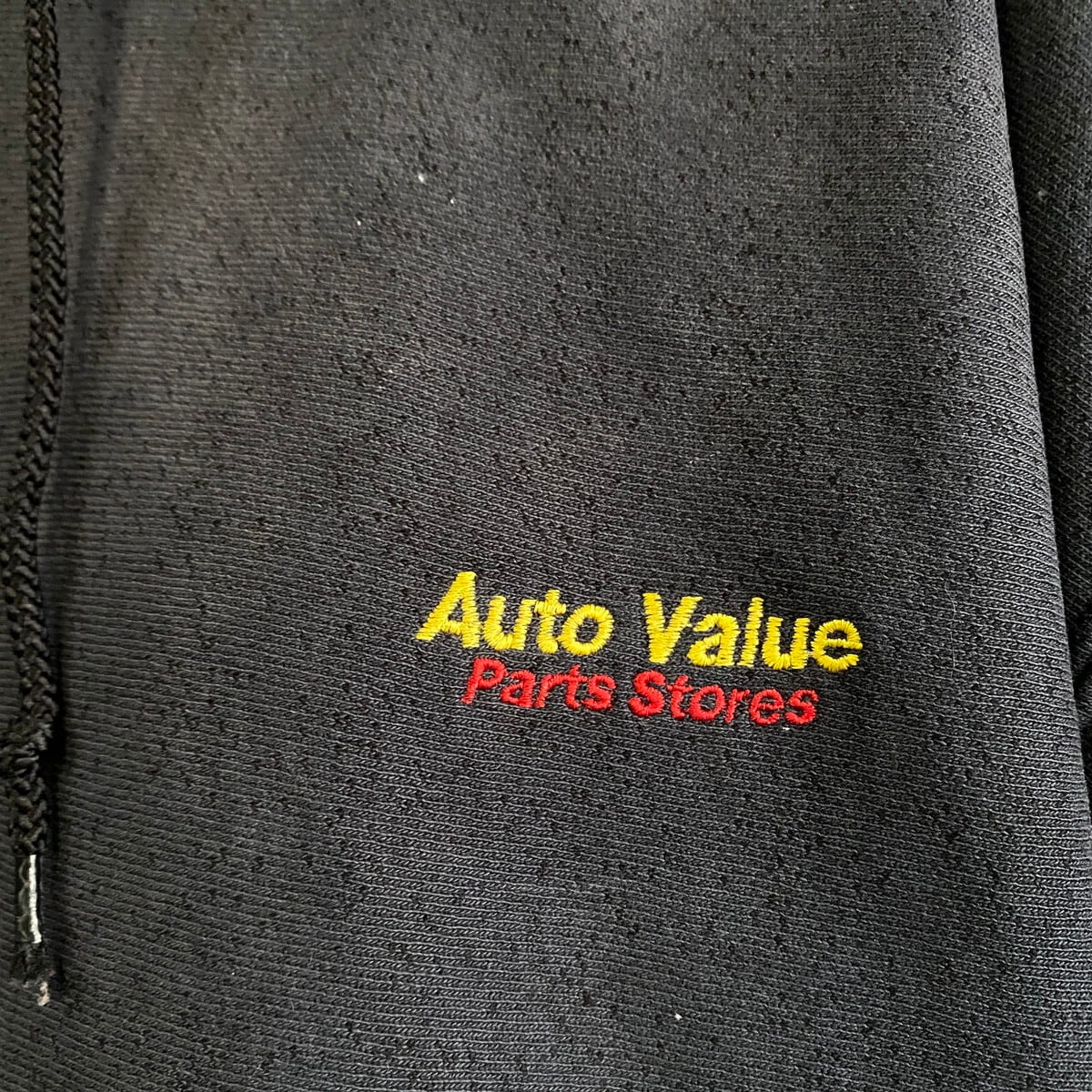 ◎アメリカ合衆国の自動車部品店のロゴの刺繍、ワッペンでカスタムされたリバースウィーブです。色落ち、ダメージのバランスも良く雰囲気抜群のスペシャルなアイテムです。