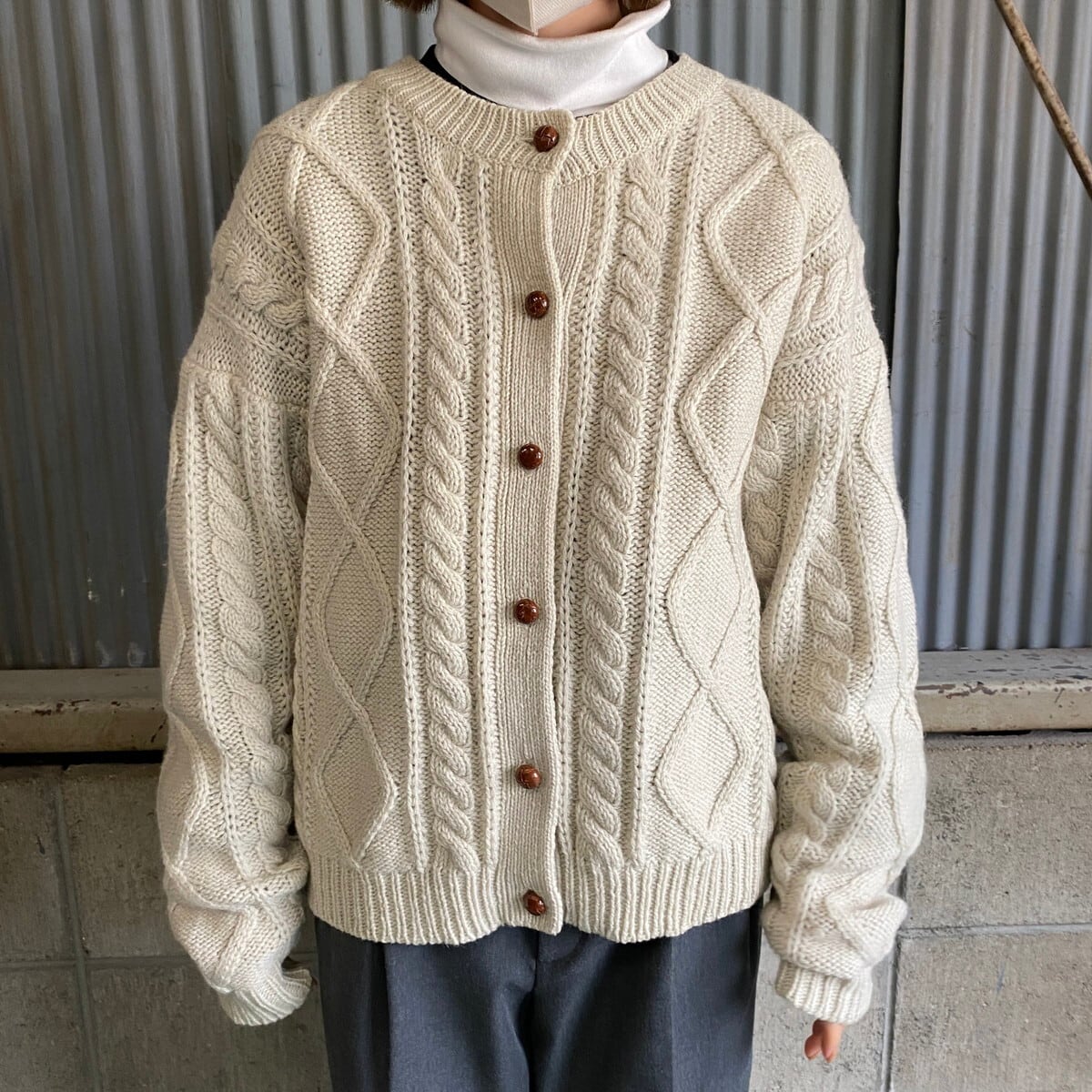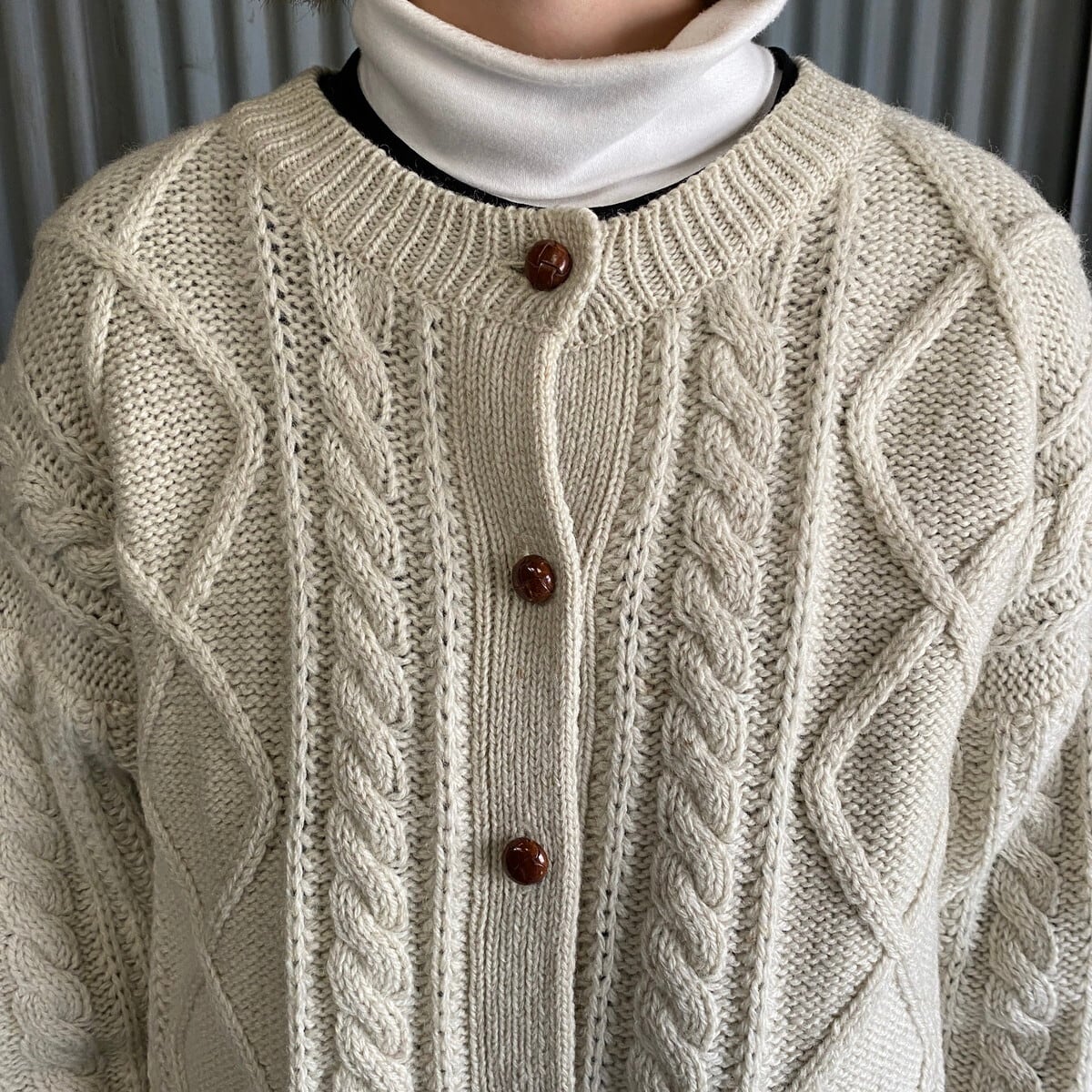 ■80年代 CAPE ISLE KNITTERS ケーブルニット カーディガン メンズM 古着 80s ビンテージ ヴィンテージ エルボーパッチ ベージュ 【ニットセーター】