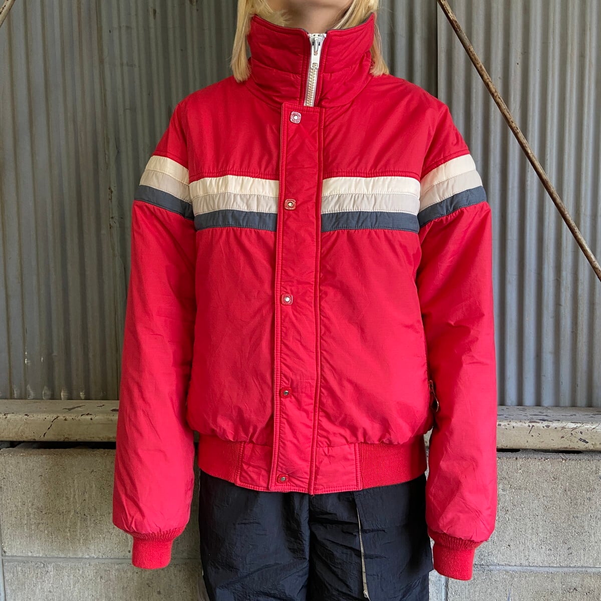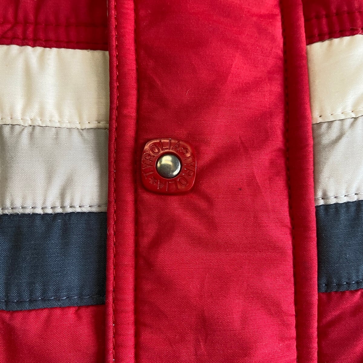 ■80〜90年代 TYROLIA 中綿 ナイロン スキージャケット メンズL 古着 80s 90s ヴィンテージ ハイネック レッド 赤 ホワイト 白 グレー【アウトドアジャケット】
