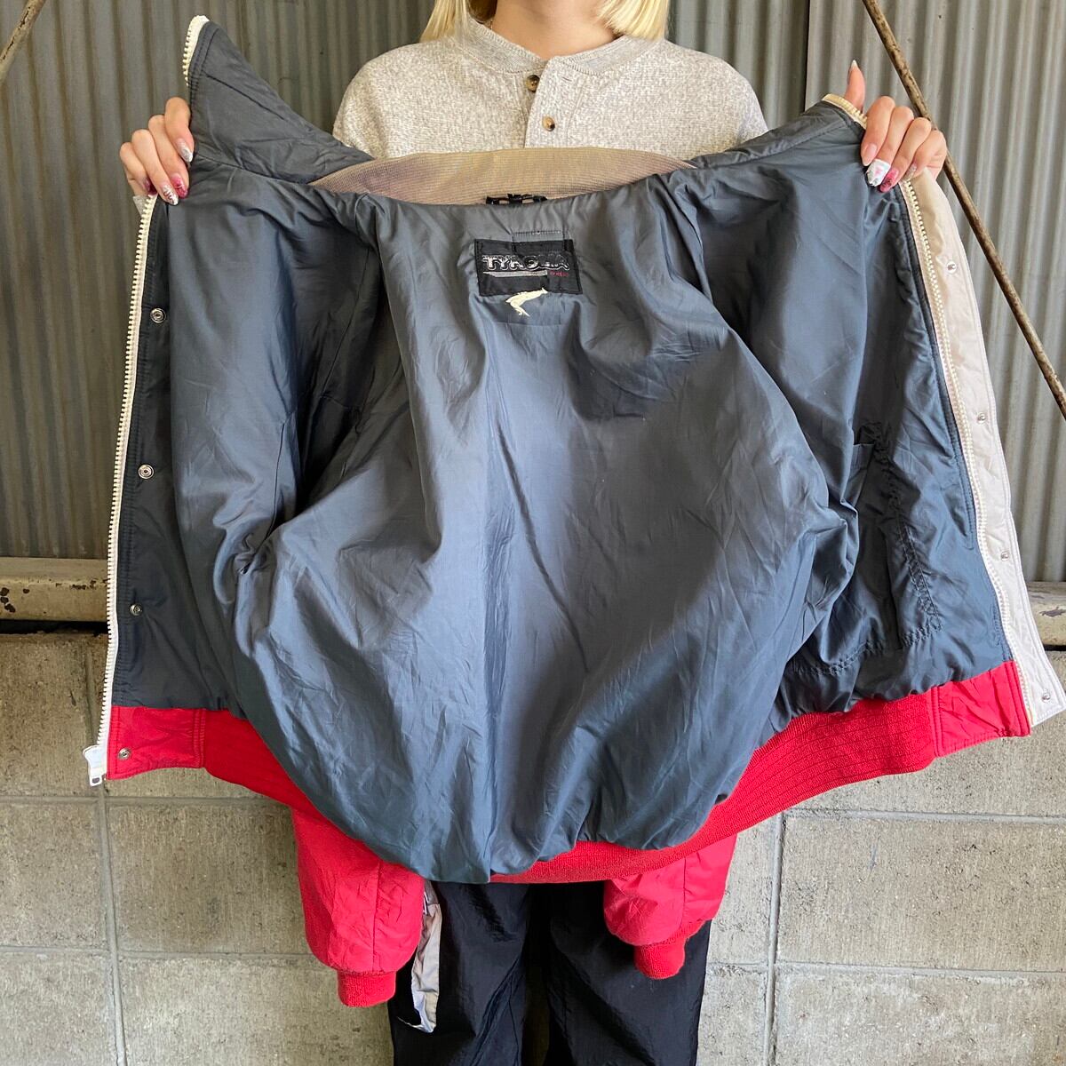 80〜90年代 TYROLIA 中綿 ナイロン スキージャケット メンズL 古着 80s 90s ヴィンテージ ハイネック レッド 赤 ホワイト 白 グレー【アウトドアジャケット】