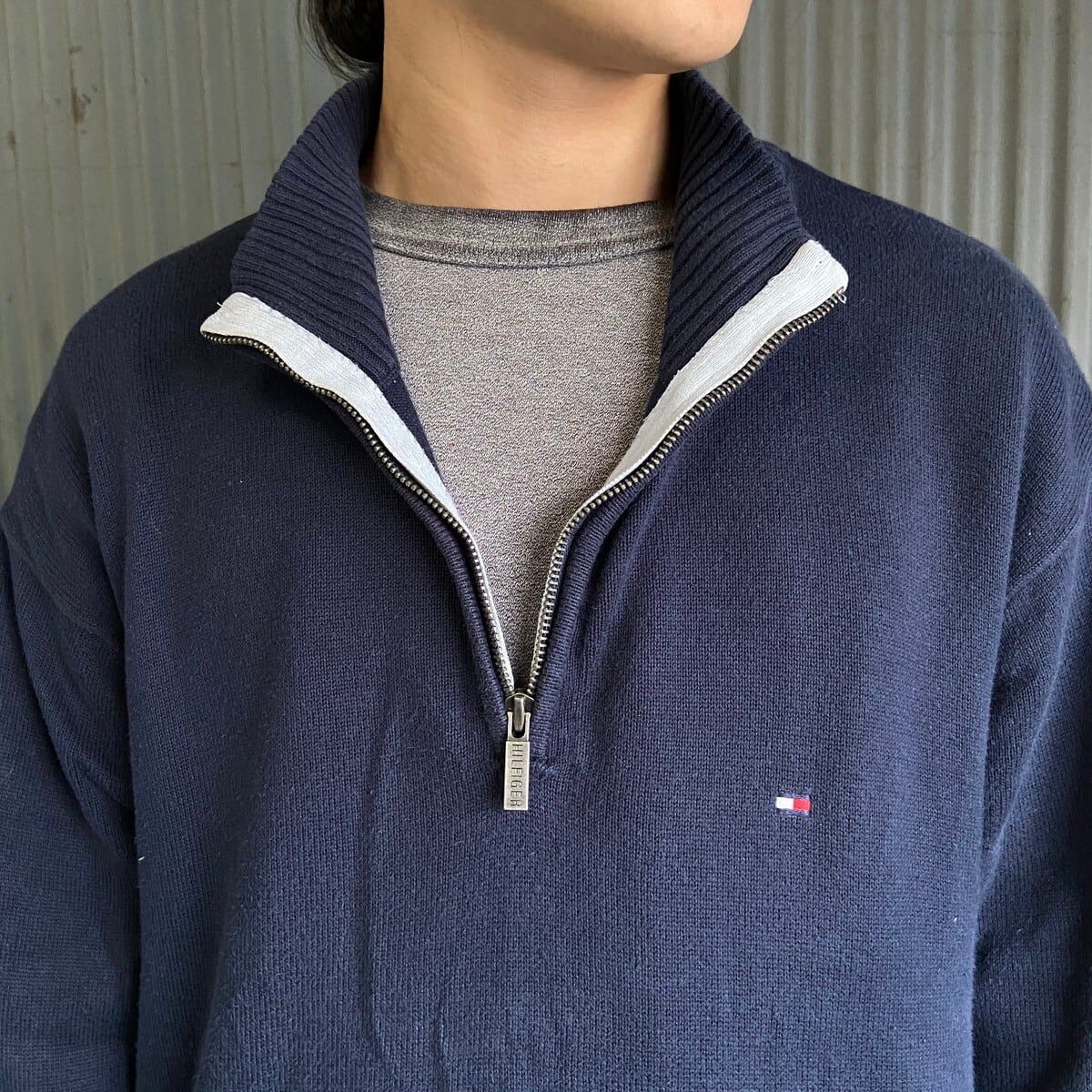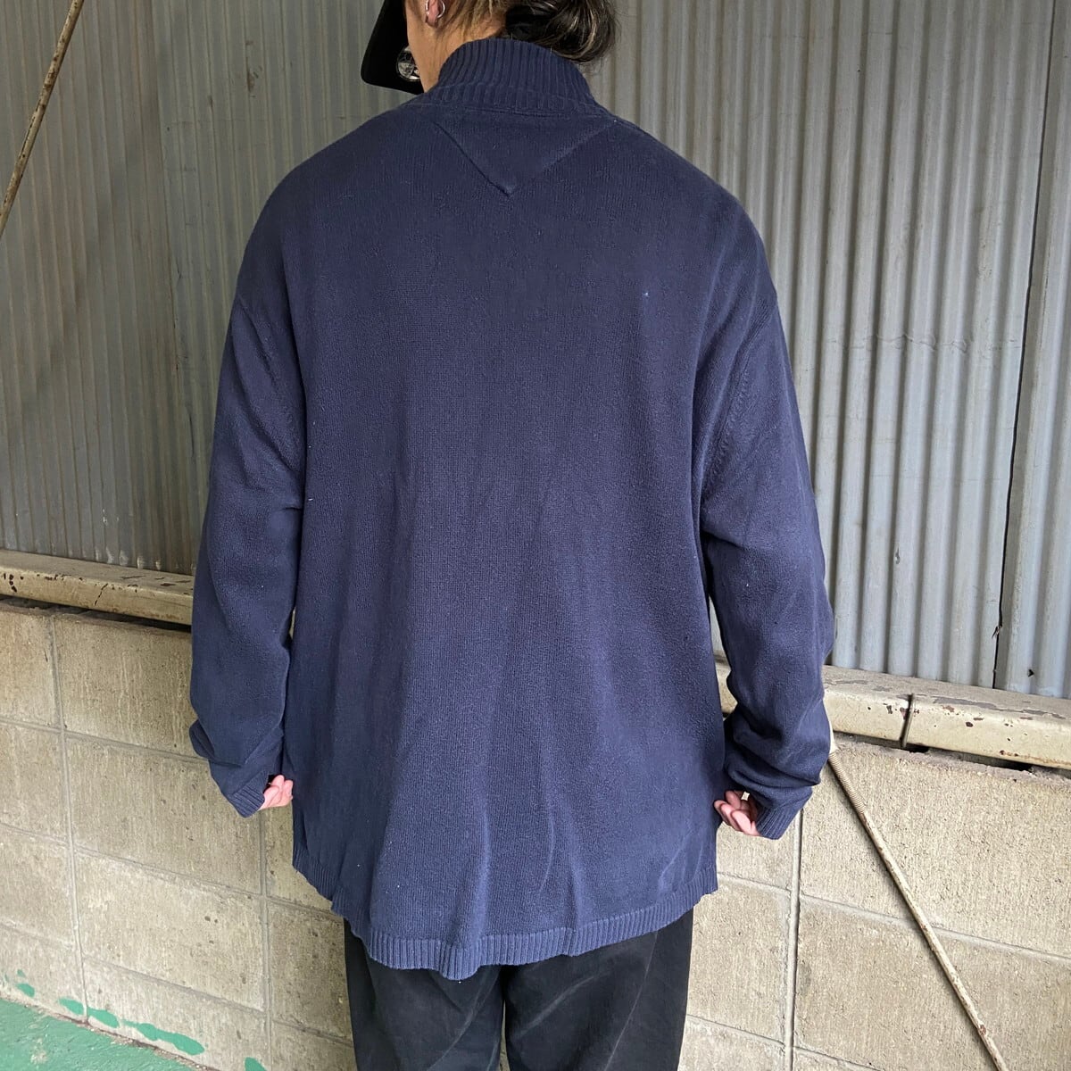■TOMMY HILFIGER トミーヒルフィガー ハーフジップ コットンニットセーター メンズXL 古着 ワンポイントロゴ刺繍 ネイビー【ニットセーター】