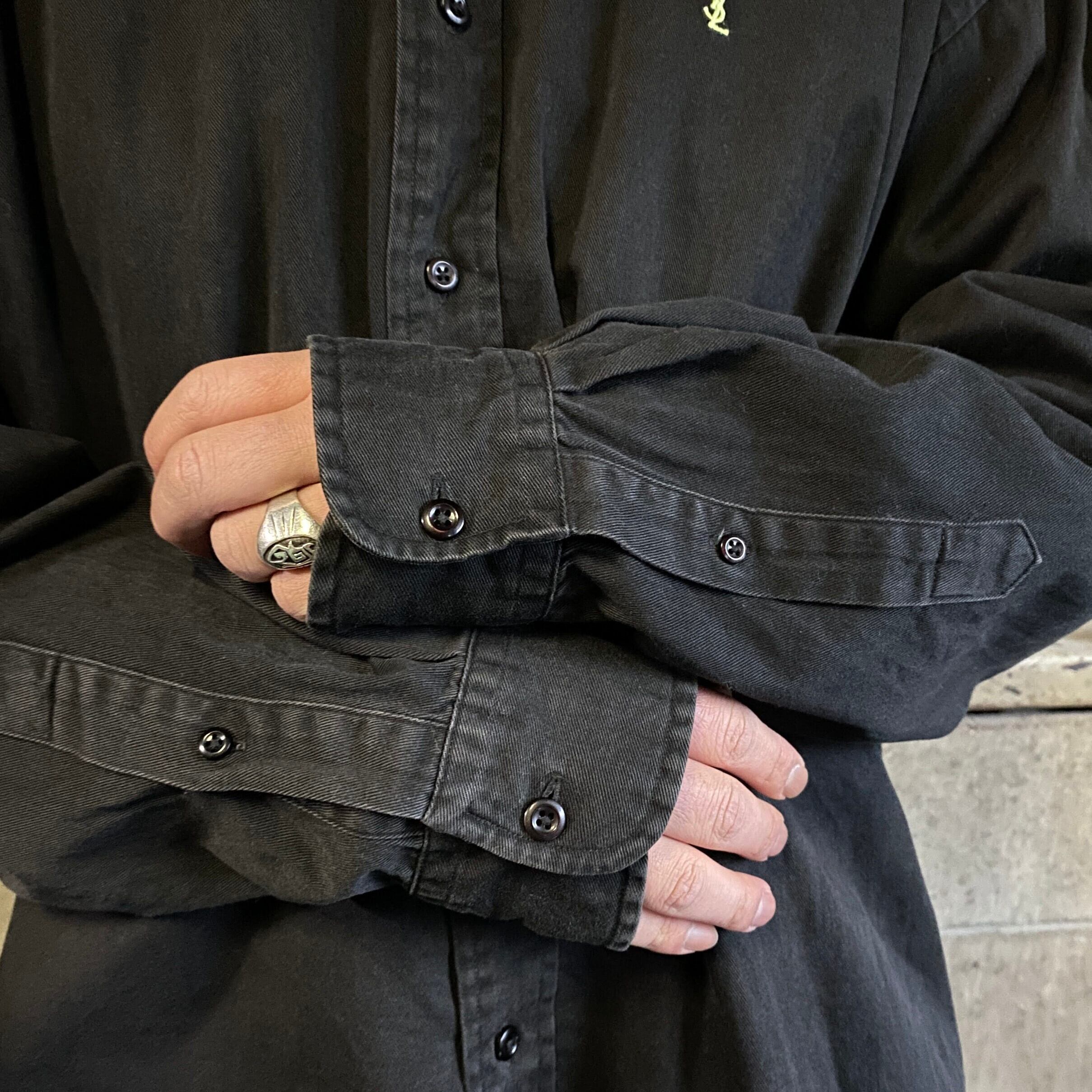 ■イヴサンローラン ワンポイントロゴ 刺繍 長袖 コットンツイルシャツ メンズXL 古着 YVES SAINT LAURENT POUR HOMME ボタンダウンシャツ B.Dシャツ ブラック 黒【長袖シャツ】