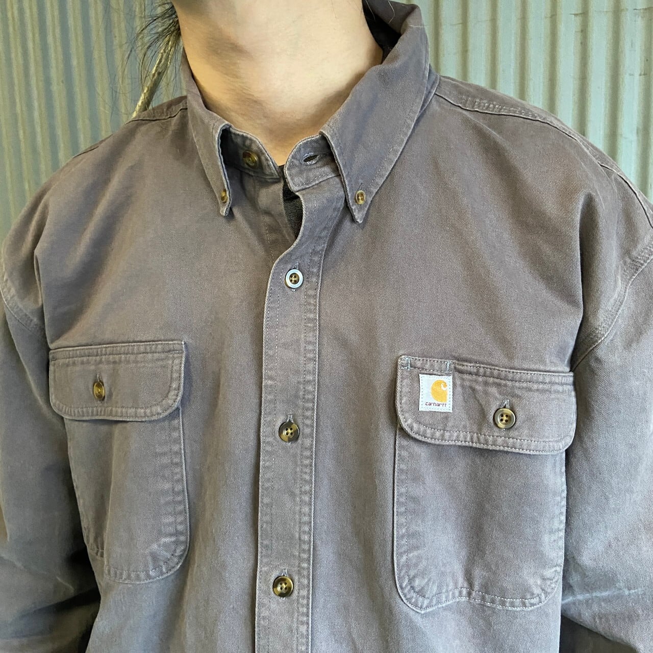 ■Carhartt カーハート コットンツイル ワークシャツ メンズXL 古着 ワンポイントロゴ チャコールグレー 灰色【長袖シャツ】