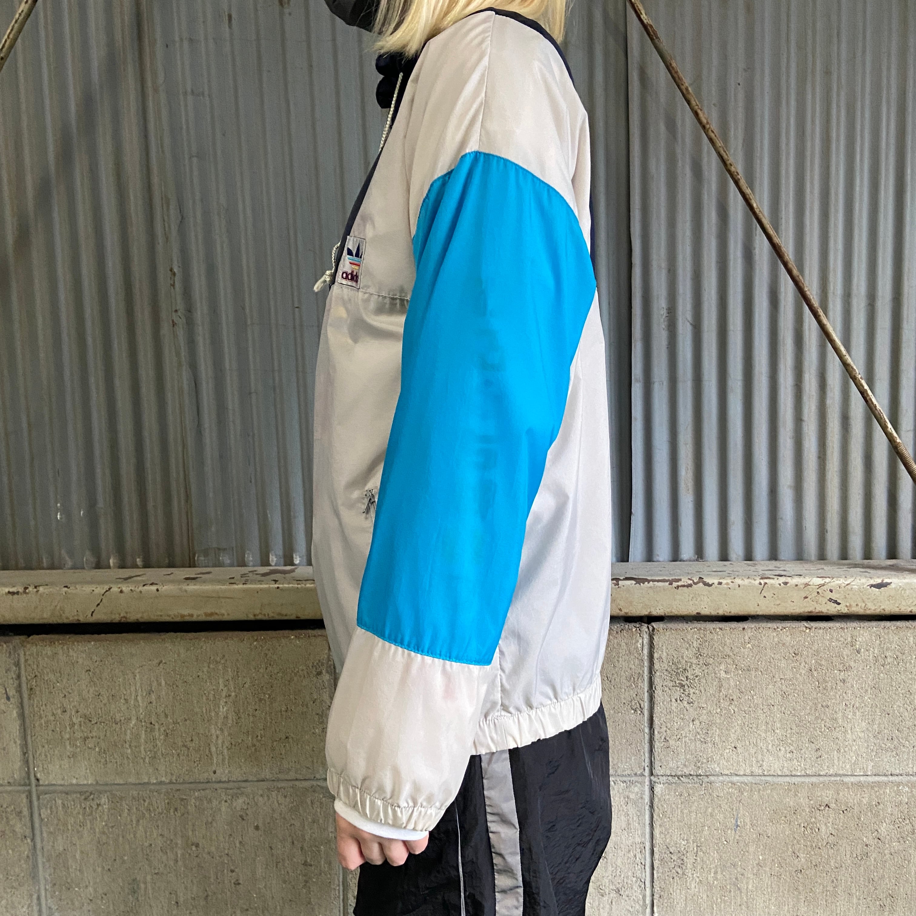 ■80年代 adidas アディダス ハーフジップ プルオーバー ナイロンジャケット レディースL 古着 80s ビンテージ ヴィンテージ ライトグレー×ネイビー×ライトブルー フード収納型 【ナイロンジャケット】