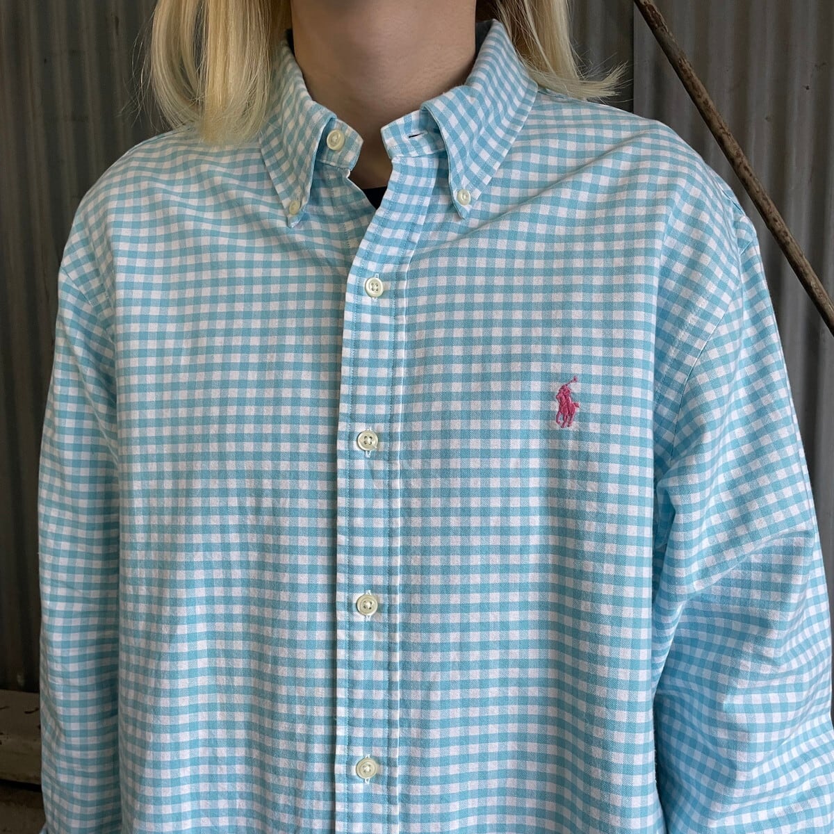 ■ RALPH LAUREN ラルフローレン 長袖 ギンガムチェックシャツ メンズL 古着 ボタンダウンシャツ ライトブルー 水色 【長袖シャツ】