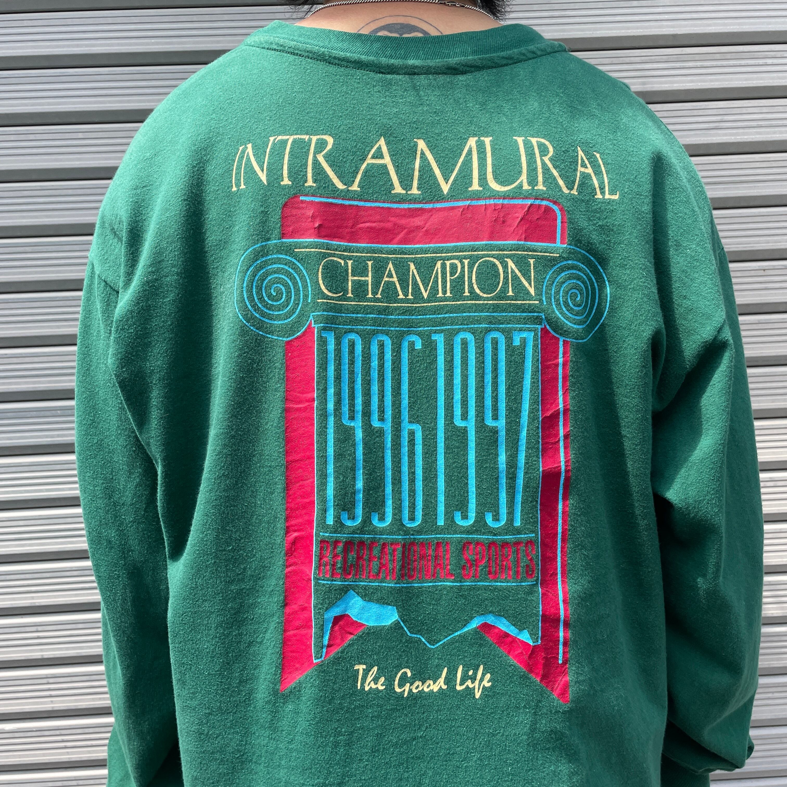■90年代 TU INTRAMURAL スポーツ 胸ロゴ バックプリント ロングTシャツ メンズXL 古着 90s ヴィンテージ ビンテージ 長袖 ロンT グリーン 緑色 【ロングTシャツ】