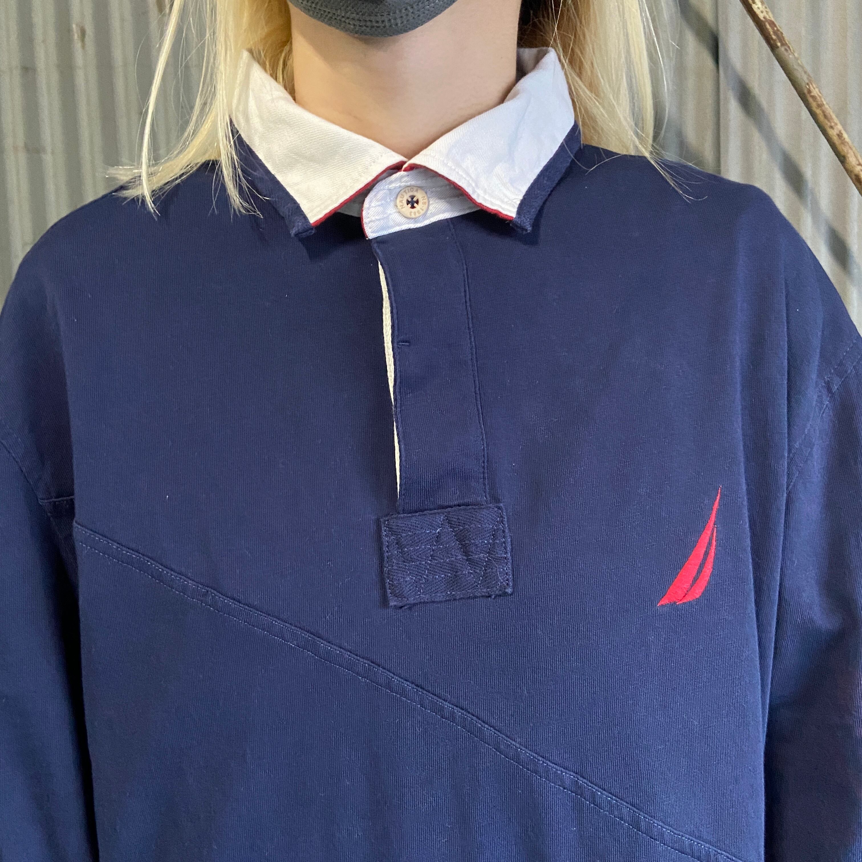 Nautica ノーティカ ワンポイントロゴ刺繍 Tシャツ地 ラガーシャツ メンズL 古着 ネイビー 紺【ポロシャツ・ラガーシャツ】