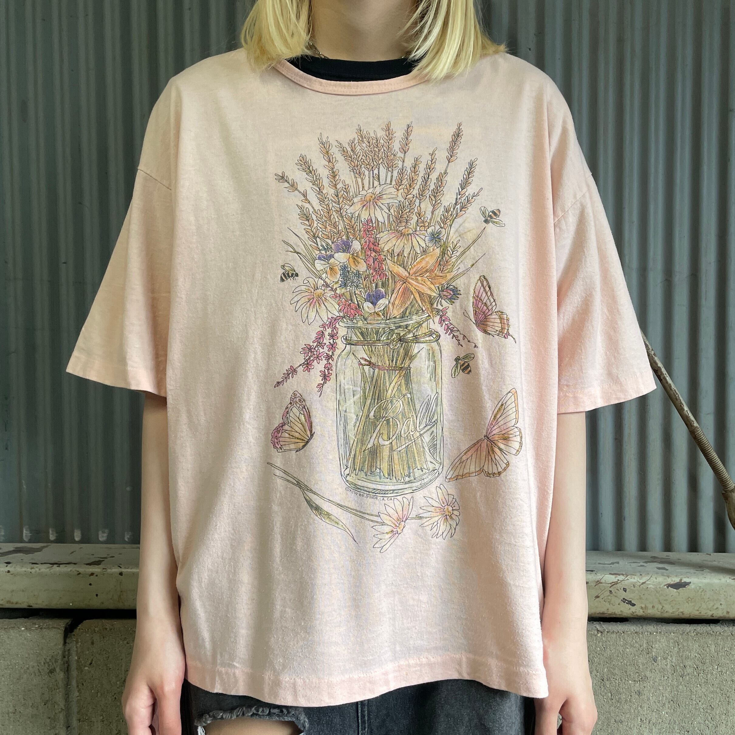 USA製 80年代 蝶々蜂 フラワー アニマル アートプリントTシャツ レディースL 古着 80s ヴィンテージ ビンテージ 動物 花柄 サーモンピンク シングルステッチ 【Tシャツ】【SA2501-50】