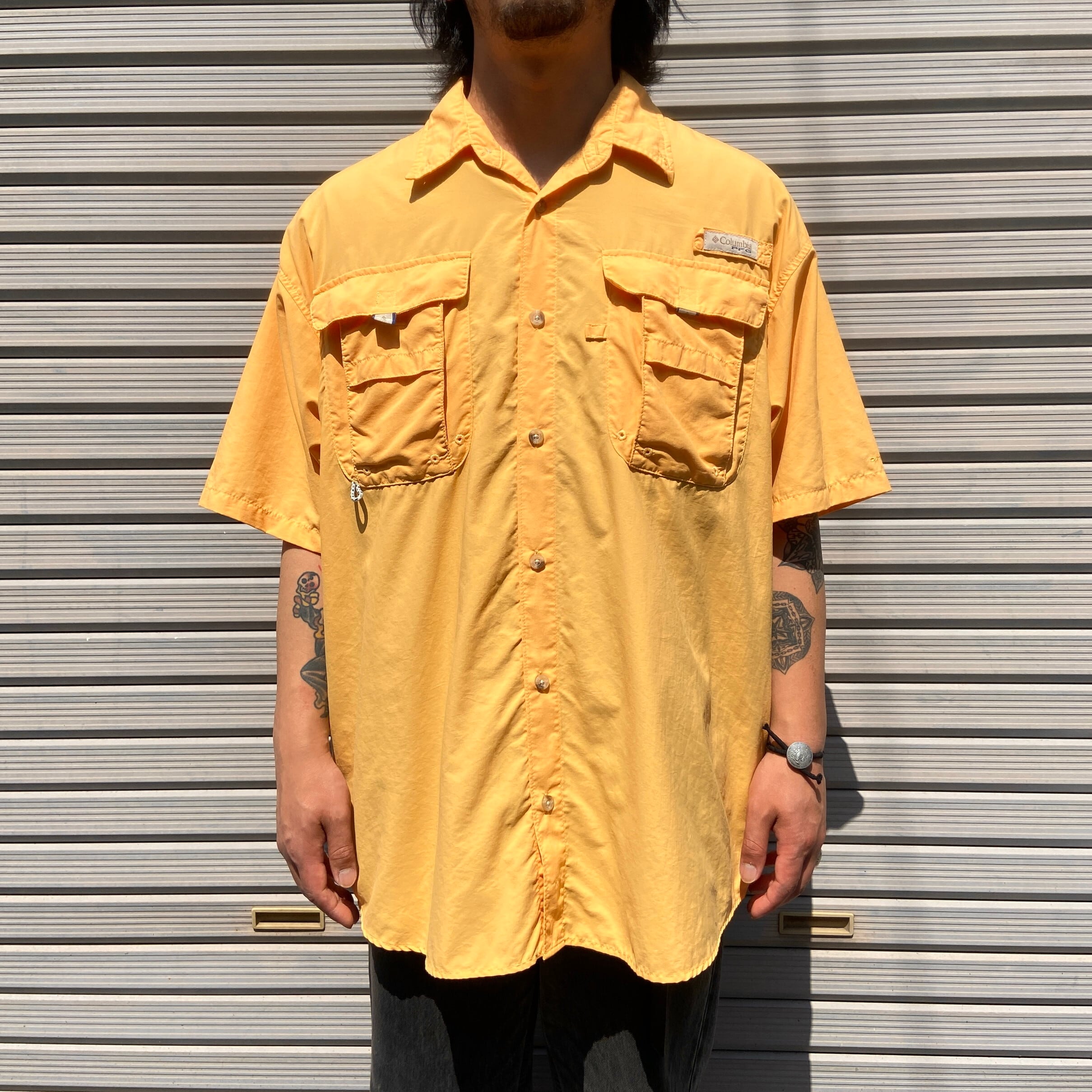 ■Columbia PFG コロンビア 半袖 フィッシングシャツ メンズL 古着 イエロー 黄色 ボタンダウン【半袖シャツ】