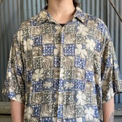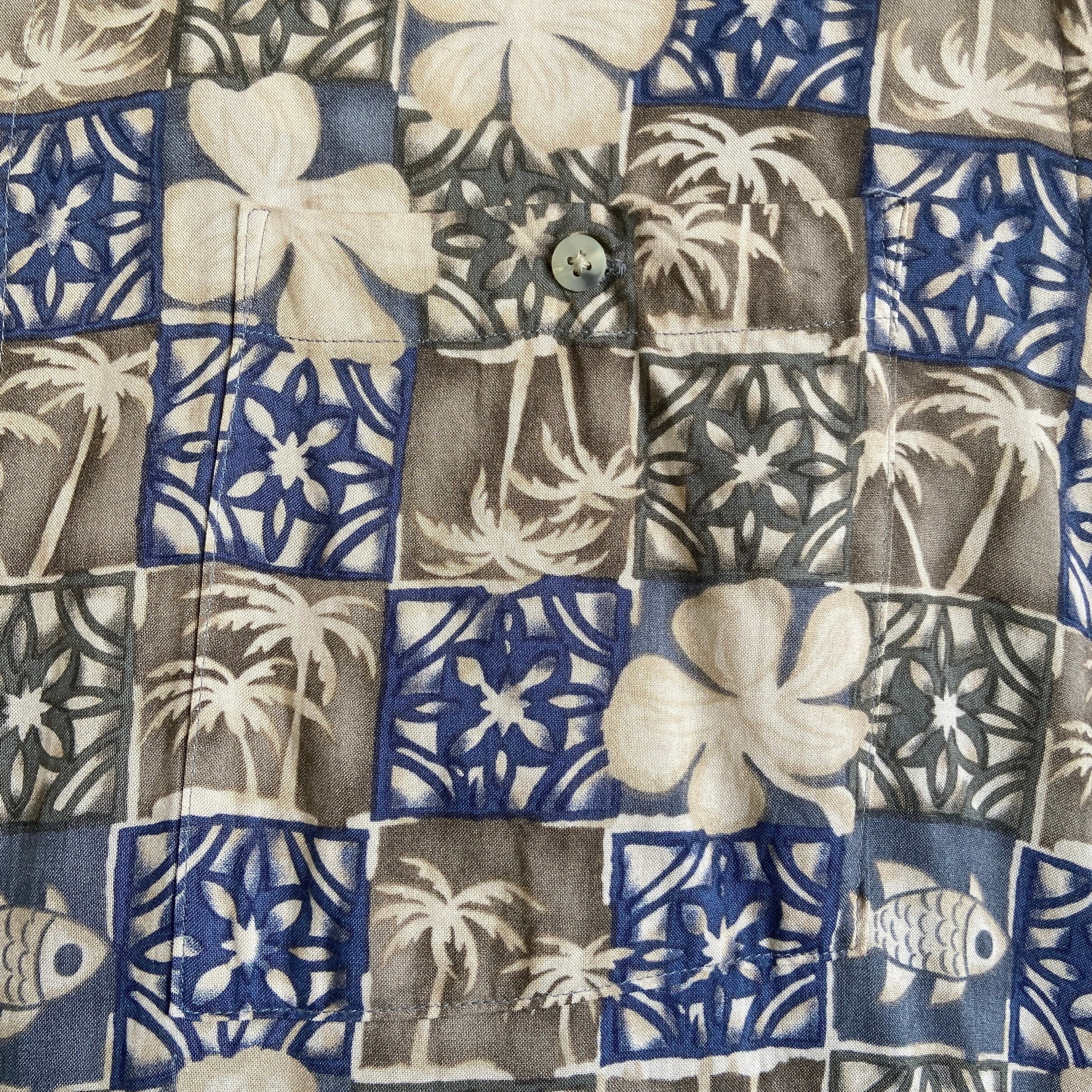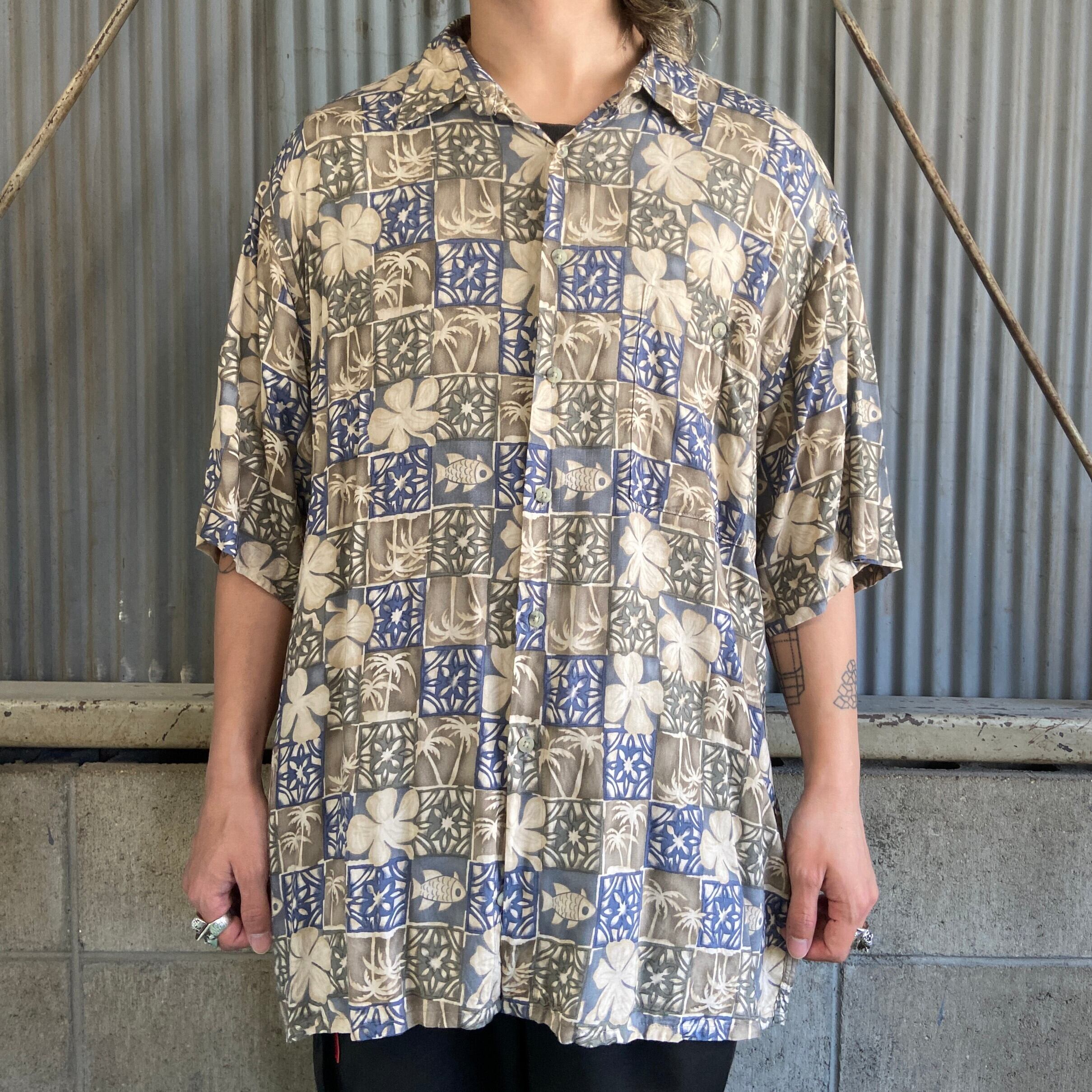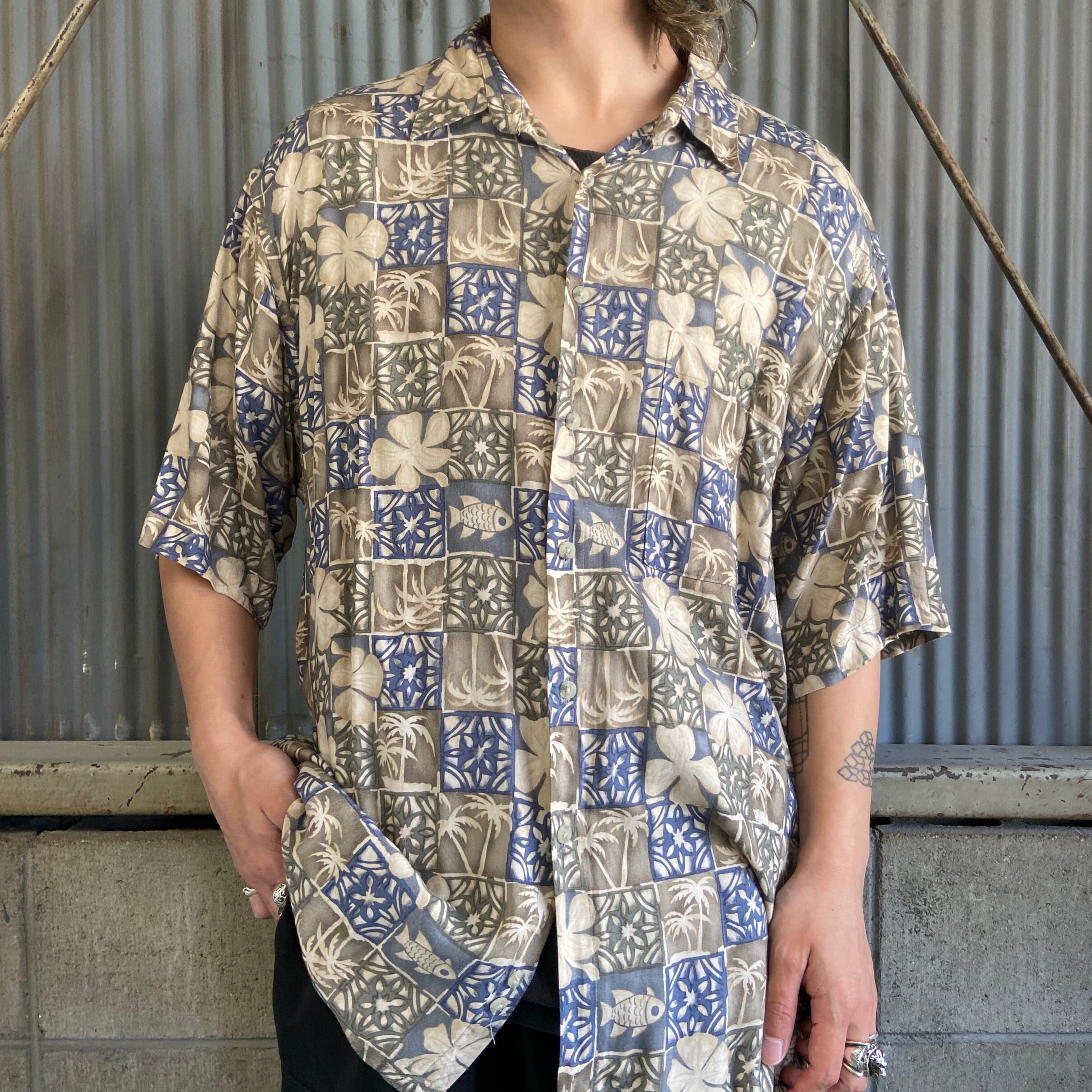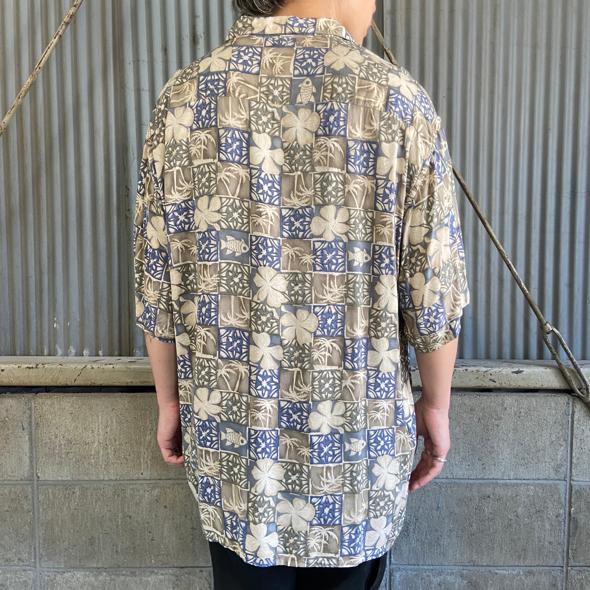 90年代 pierre cardin ピエールカルダン 半袖 レーヨン 総柄 アロハシャツ メンズL 古着 ブラウン×ネイビー 90s ヴィンテージ ビンテージ 魚 花 ヤシの木【半袖シャツ】【SA2501-50】