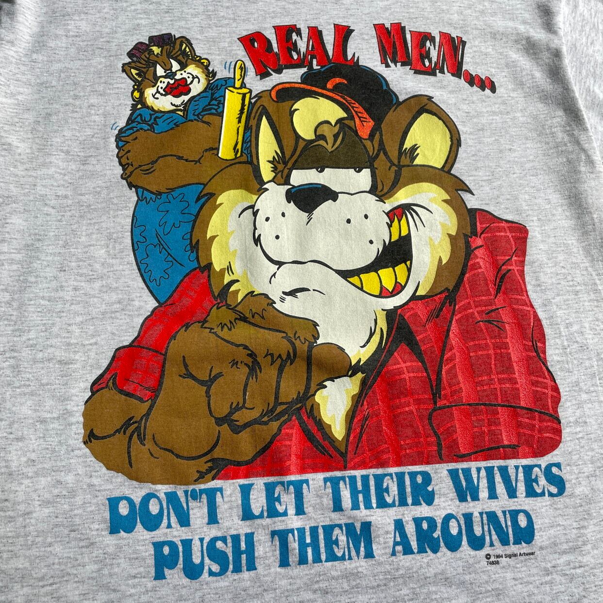 USA製 90年代 ファニーメッセージ キャラクタープリントTシャツ メンズL 古着 90s ヴィンテージ ビンテージ シングルステッチ 霜降りグレー【Tシャツ】【SA2501-50】