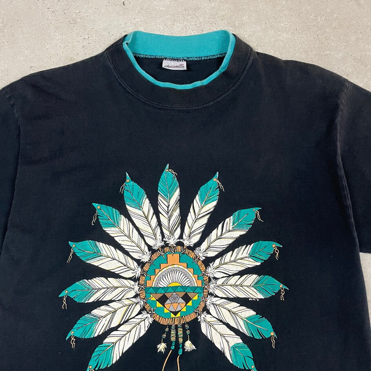 90年代 USA製 OREGON レイヤード ネイティブ柄 プリントTシャツ メンズL 古着 ブラック 黒 90s ヴィンテージ ビンテージ 裾シングルステッチ リンガー【Tシャツ】【SA2501-50】