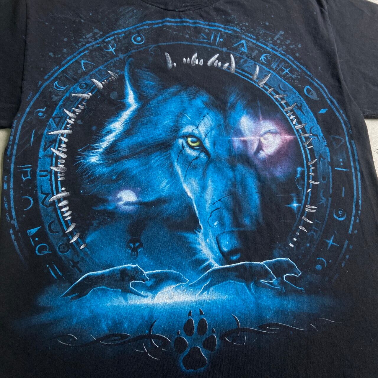 ■00年代 オオカミ アニマル プリントTシャツ メンズM 古着 動物 狼 ブラック 黒【Tシャツ】