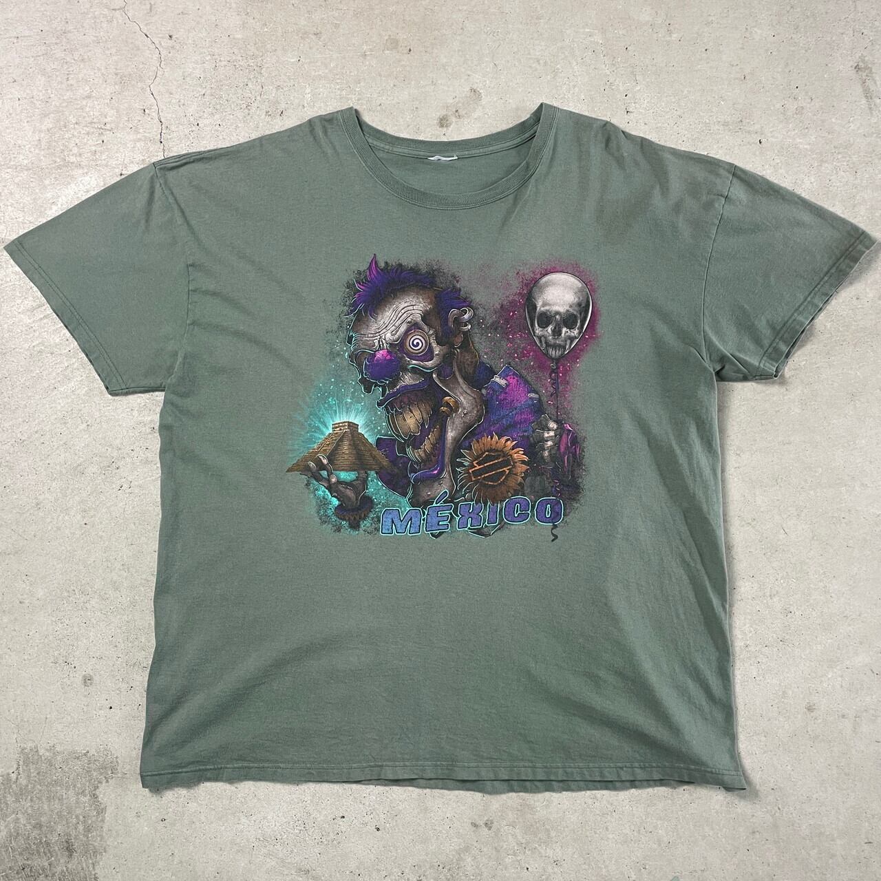 ■ビッグサイズ Harley-Davidson MEXICO ハーレーダビッドソン スカル ジョーカー ピエロ 両面プリント Tシャツ メンズ3XL相当 古着 モーターサイクル バイクTシャツ バックプリント くすみグリーン 緑色 大きいサイズ【Tシャツ】