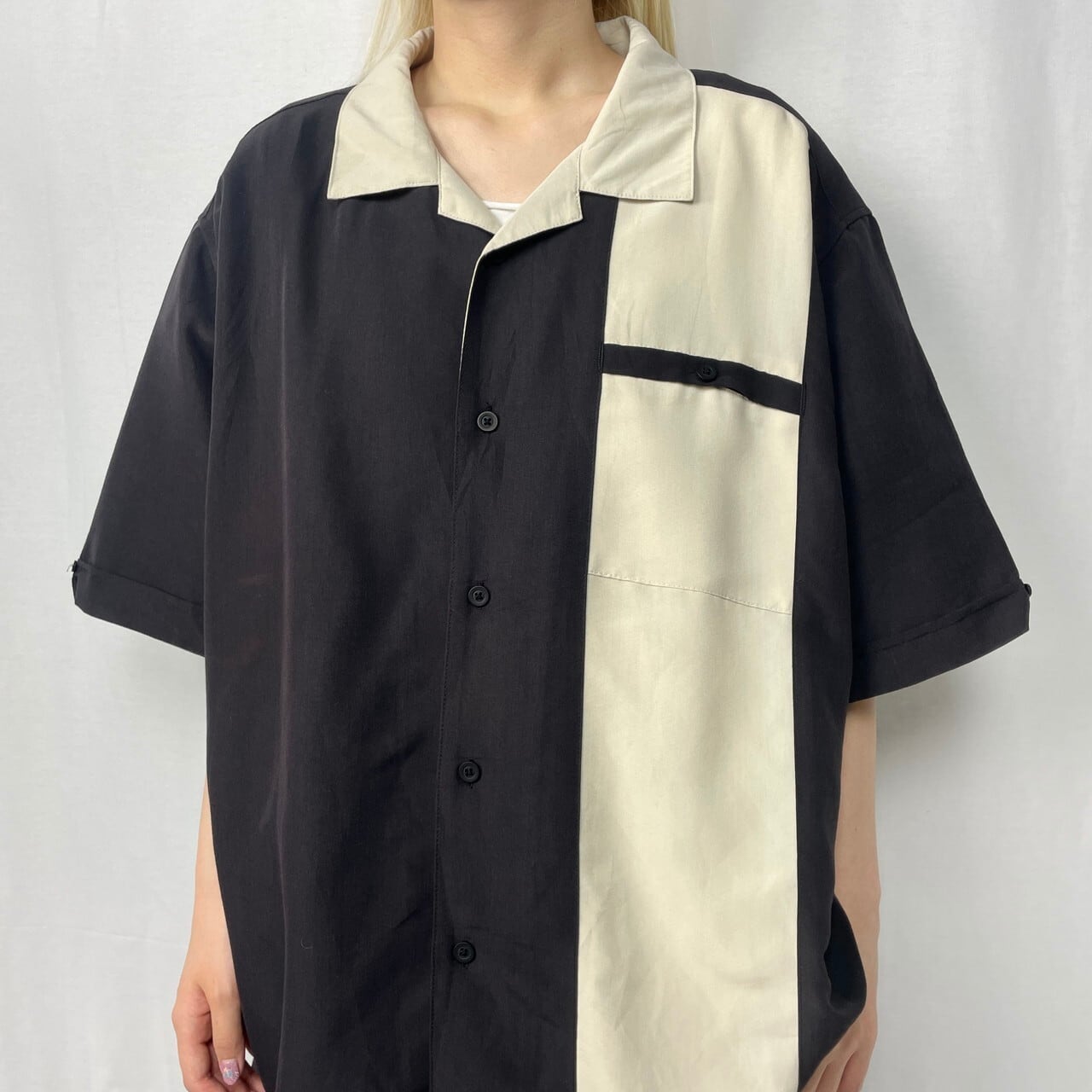 ■Centro 2トーン 切替 開襟シャツ レーヨン オープンカラーシャツ メンズXL 古着 ブラック×ベージュ【半袖シャツ】【PS0707】