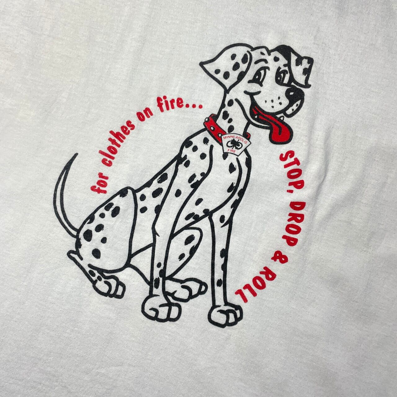 ■90年代 USA製 MINNE APOLIS FIRE DEPARTMENT ダルメシアン イヌ アニマル メッセージ 両面プリントTシャツ メンズL 古着 90s ビンテージ ヴィンテージ シングルステッチ 動物 犬 ホワイト 白【Tシャツ】