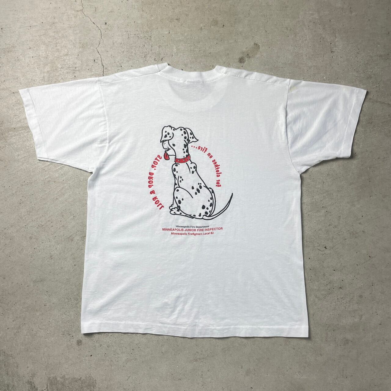 90年代 USA製 MINNE APOLIS FIRE DEPARTMENT ダルメシアン イヌ アニマル メッセージ 両面プリントTシャツ メンズL 古着 90s ビンテージ ヴィンテージ シングルステッチ 動物 犬 ホワイト 白【Tシャツ】【PS2307T】