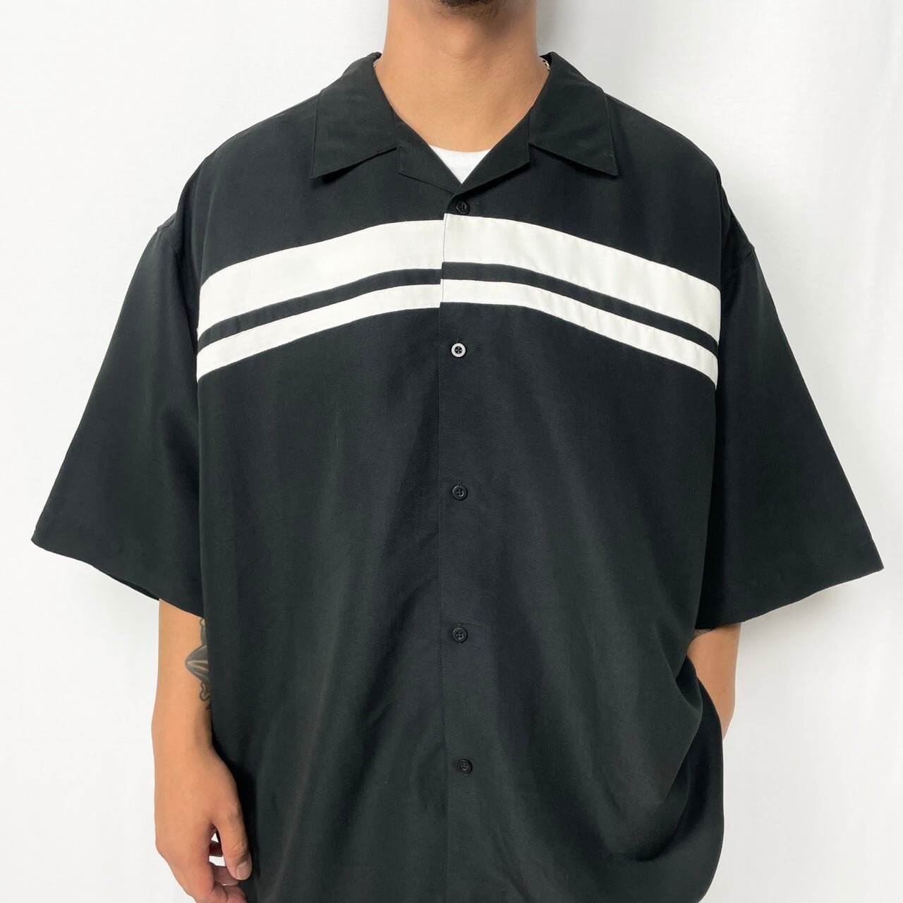 ■GEORGE 2トーン 切替 開襟シャツ 刺繍 レーヨン オープンカラーシャツ メンズ2XL 古着 ブラック×ホワイト 黒【半袖シャツ】
