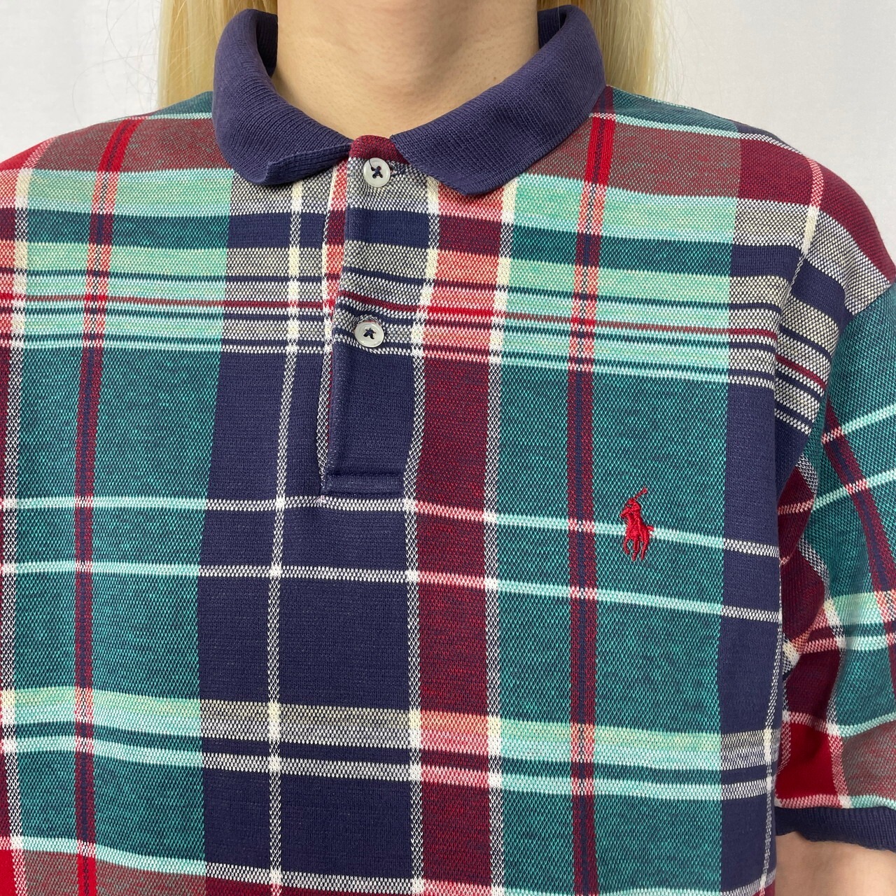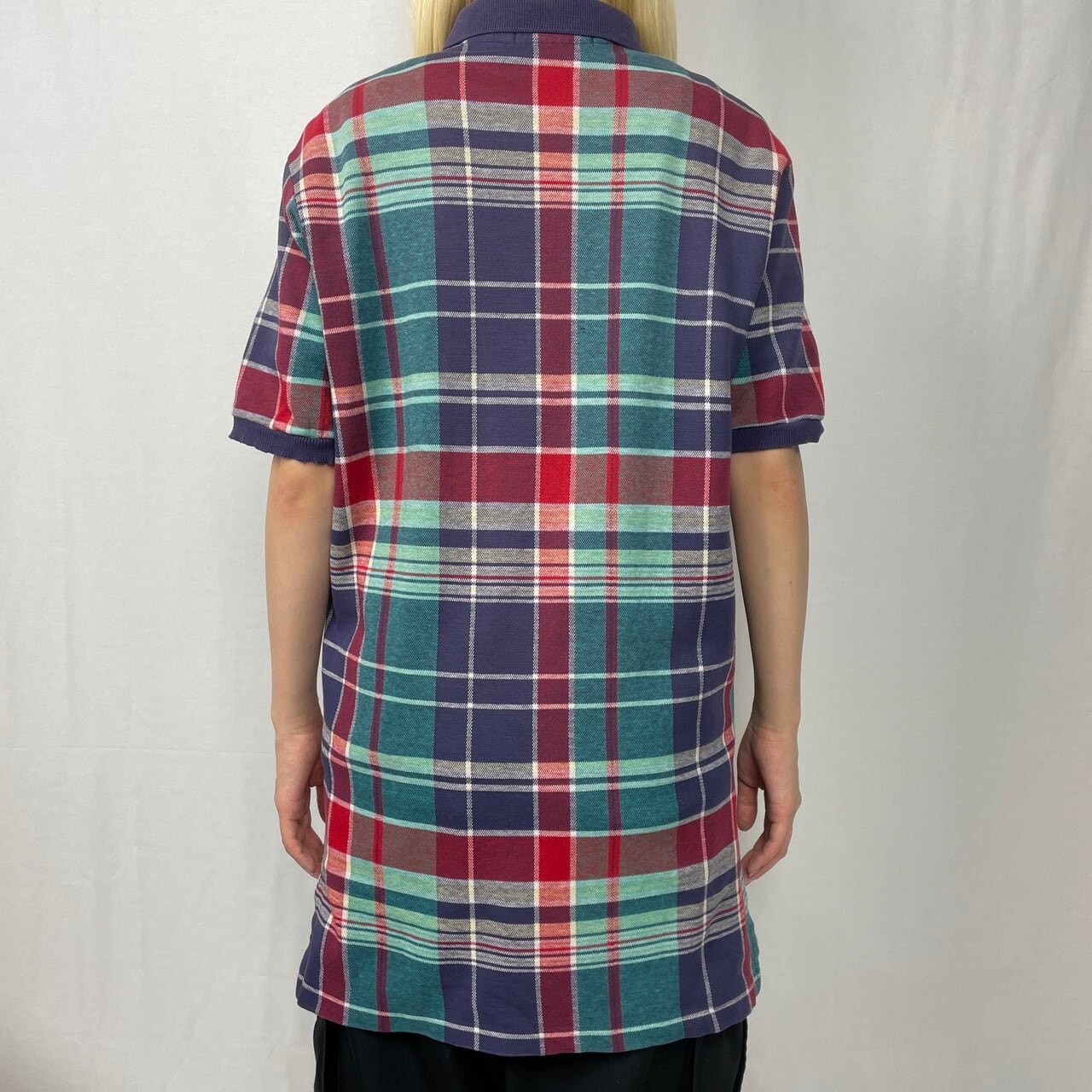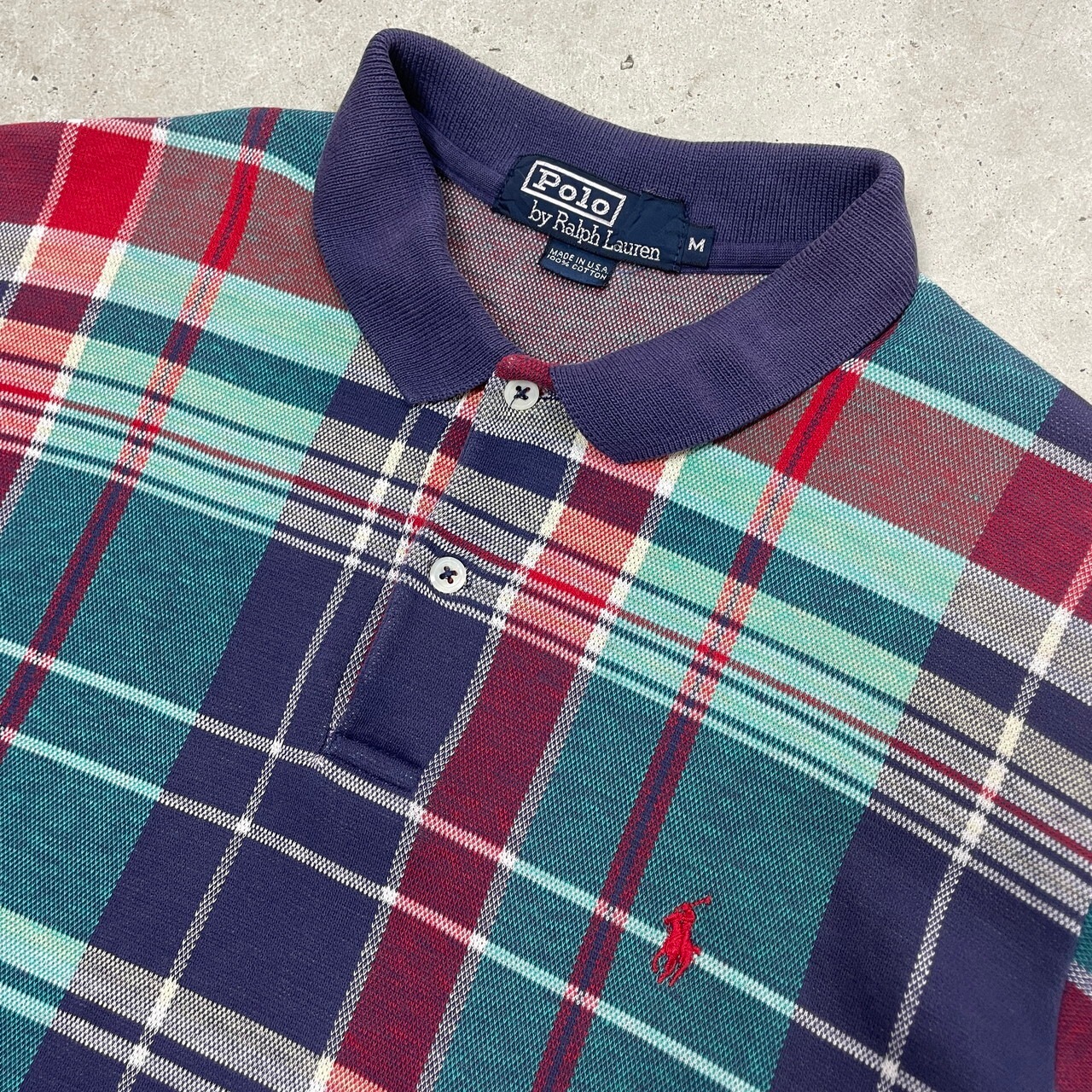 90年代 USA製 襤褸 Polo by Ralph Lauren オールドラルフローレン チェック柄 ポロシャツ メンズM 古着 90s ヴィンテージ ビンテージ ワンポイントロゴ刺繍 ボロ レッド ネイビー グリーン 赤色 紺色 緑色【ポロシャツ】【SA2501-50】