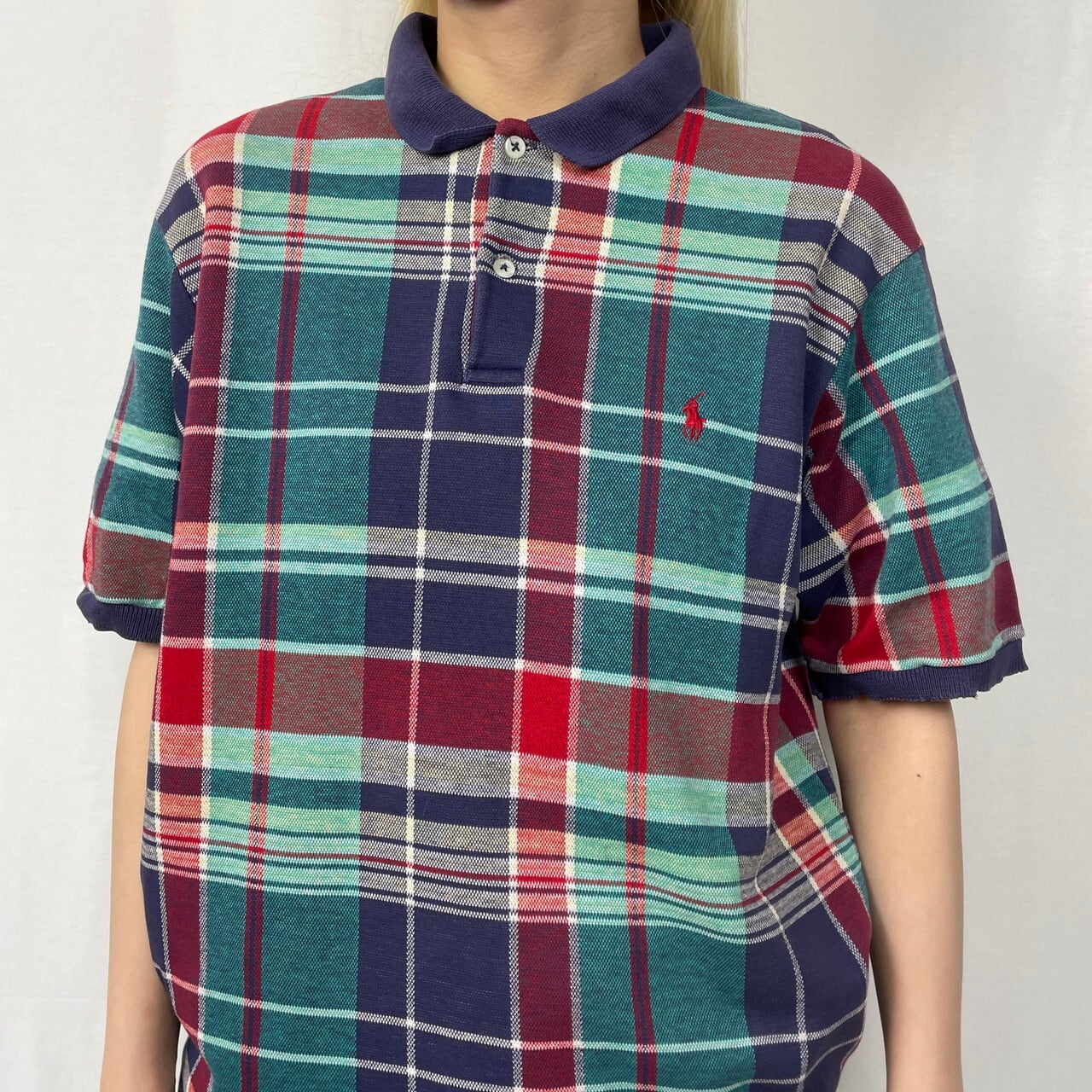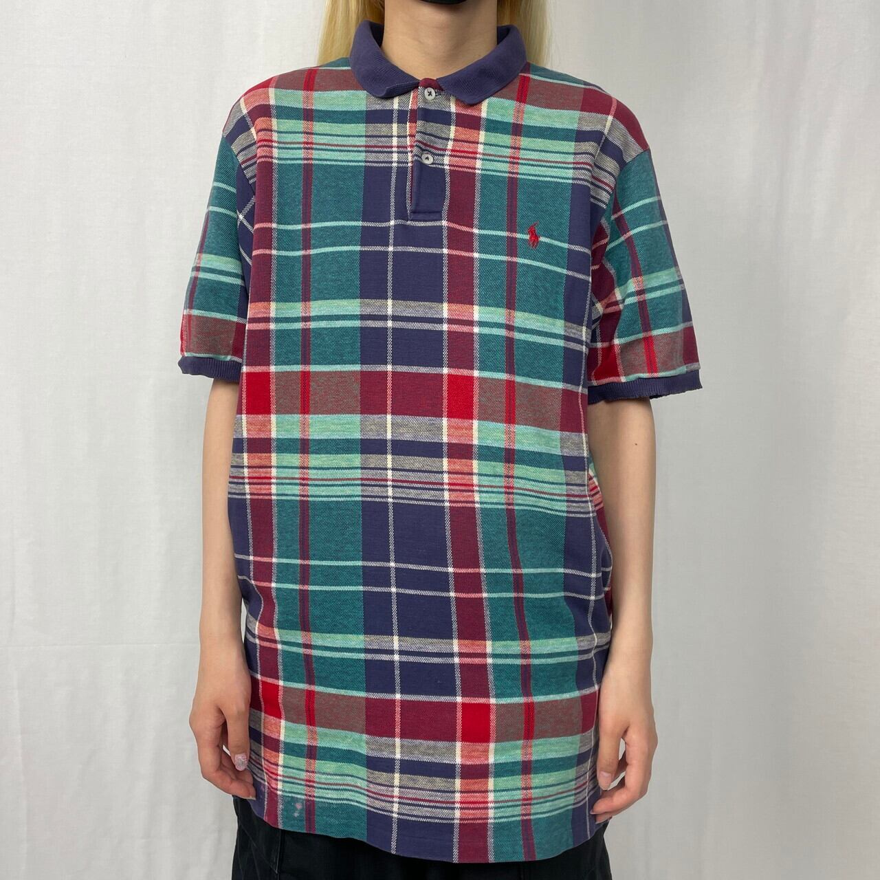 ■90年代 USA製 襤褸 Polo by Ralph Lauren オールドラルフローレン チェック柄 ポロシャツ メンズM 古着 90s ヴィンテージ ビンテージ ワンポイントロゴ刺繍 ボロ レッド ネイビー グリーン 赤色 紺色 緑色【ポロシャツ】