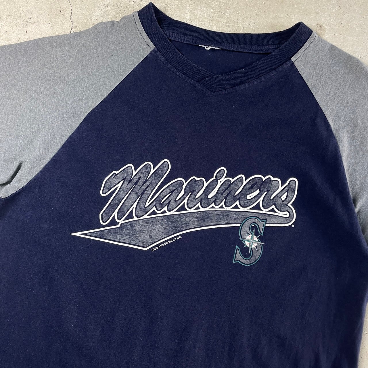 00年代 MLB SEATTLE MARINERS マリナーズ チームロゴ プリント Vネック ラグランTシャツ メンズXL相当 古着 00s ヴィンテージ ビンテージ Y2K メジャーリーグ 野球 シアトル・マリナーズ ネイビー グレー 紺色 灰色 【Tシャツ】【FSS2308-30】【SA2501-50】
