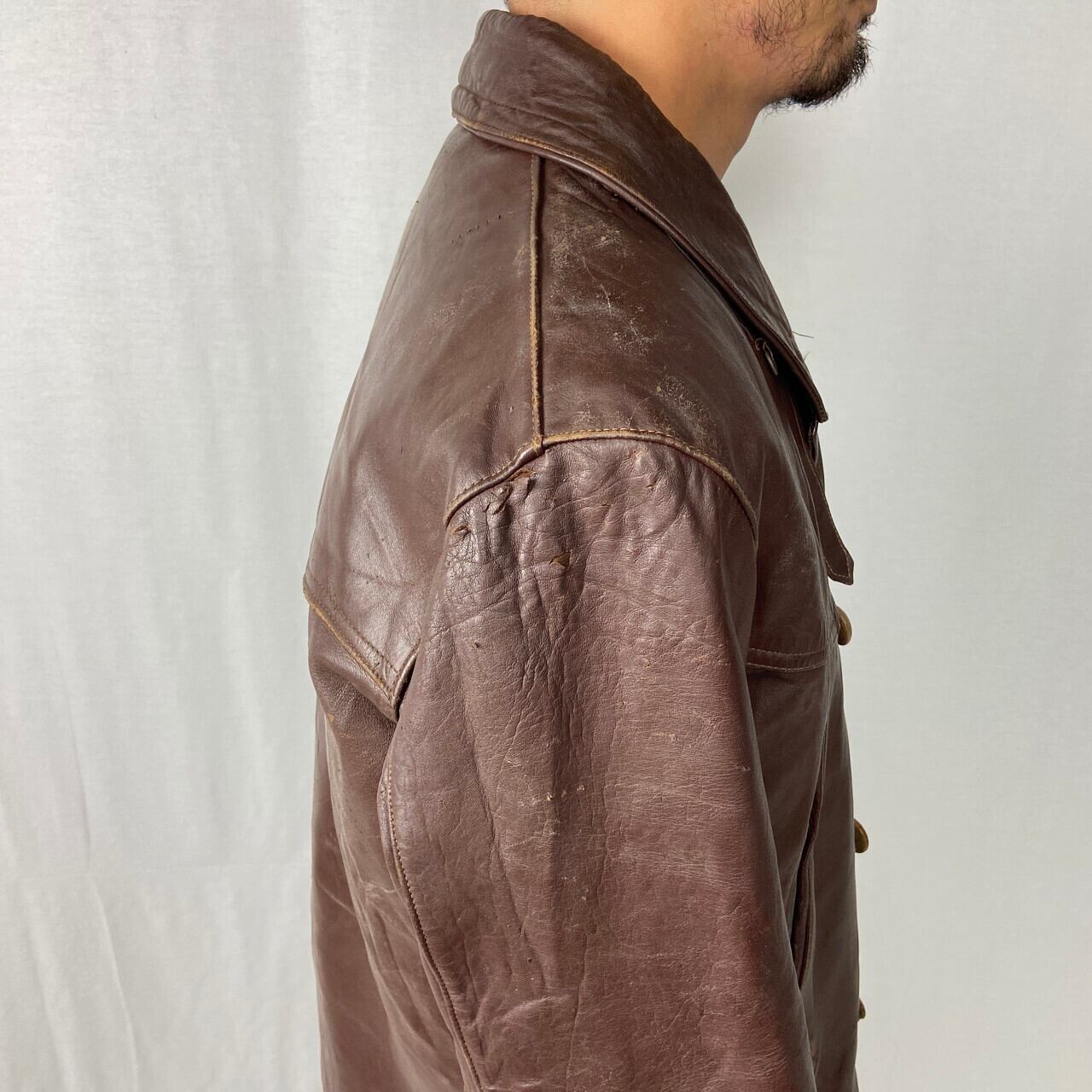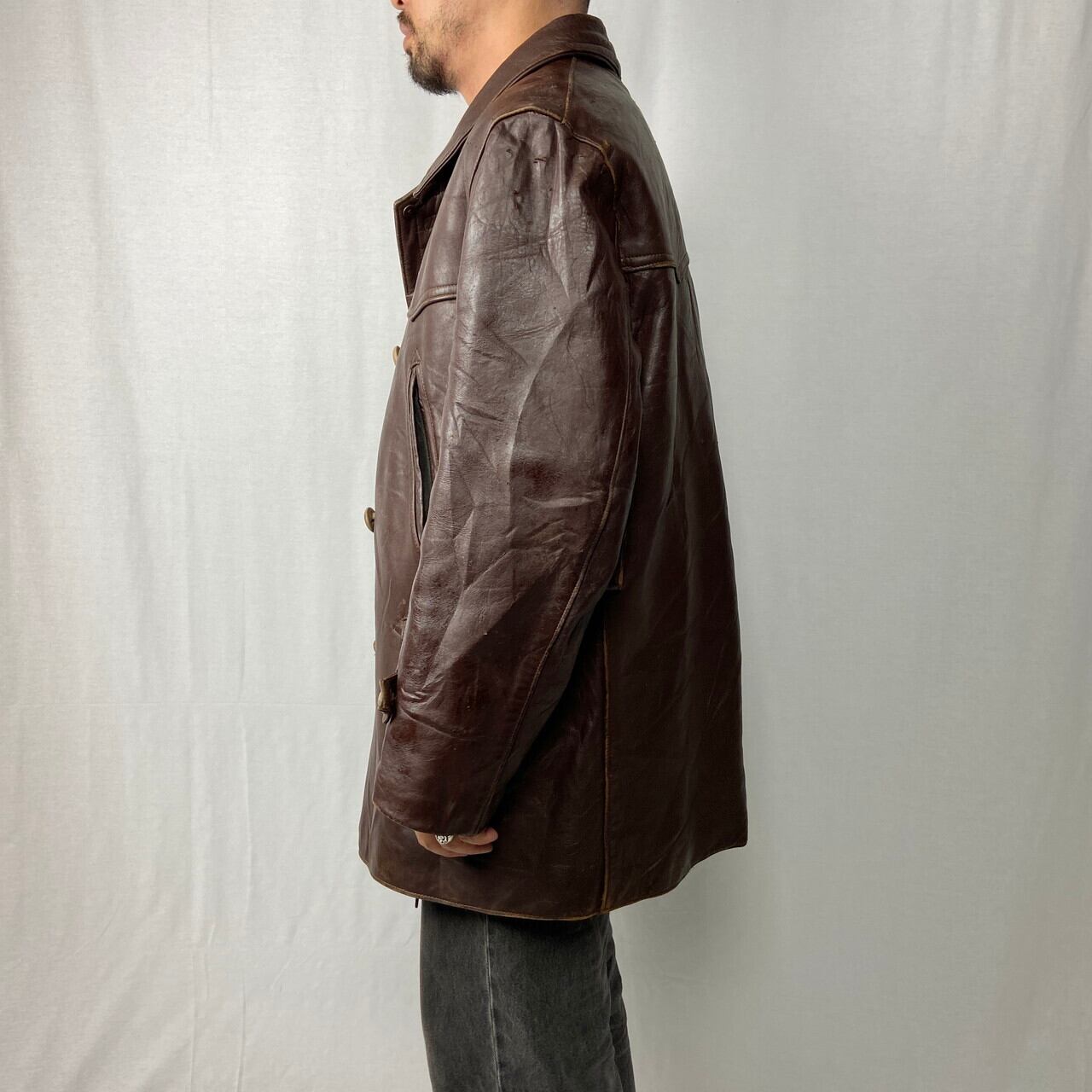 ■50~60年代 フランス ユーロ レザー マッキノーコート メンズXL相当 古着 50s 60s ビンテージ ヴィンテージ コの字留め カーコート ブラウン 茶色【レザージャケット】