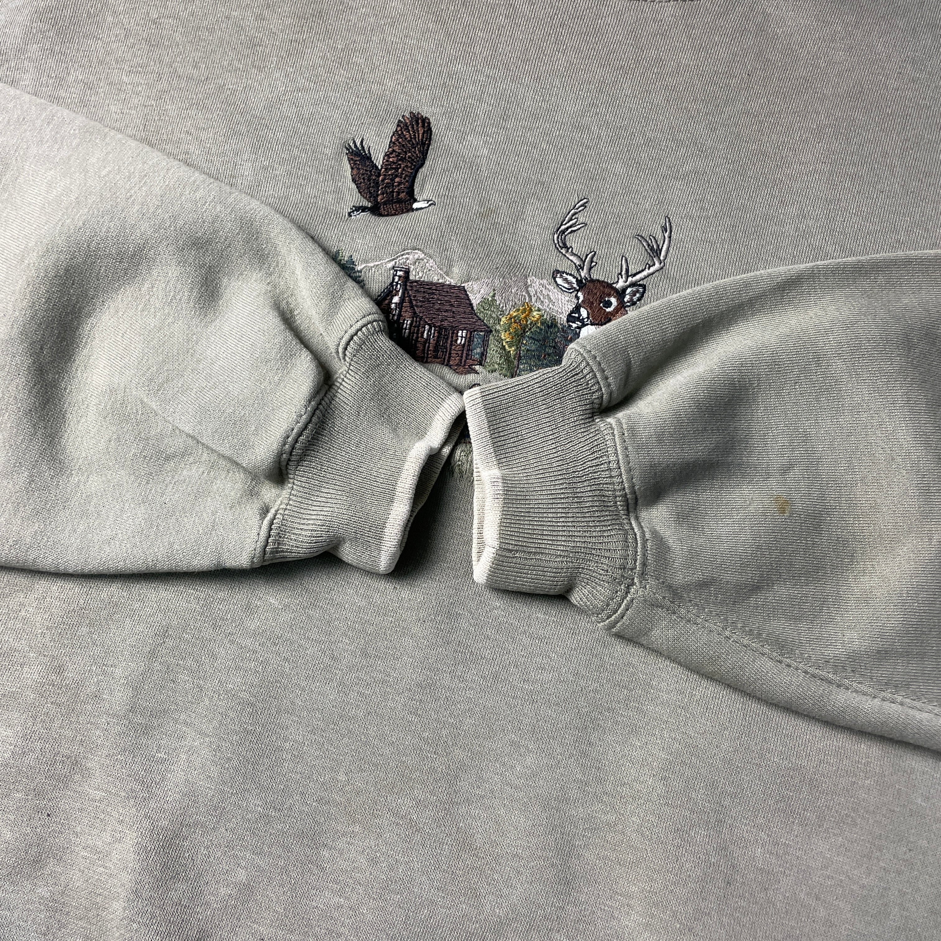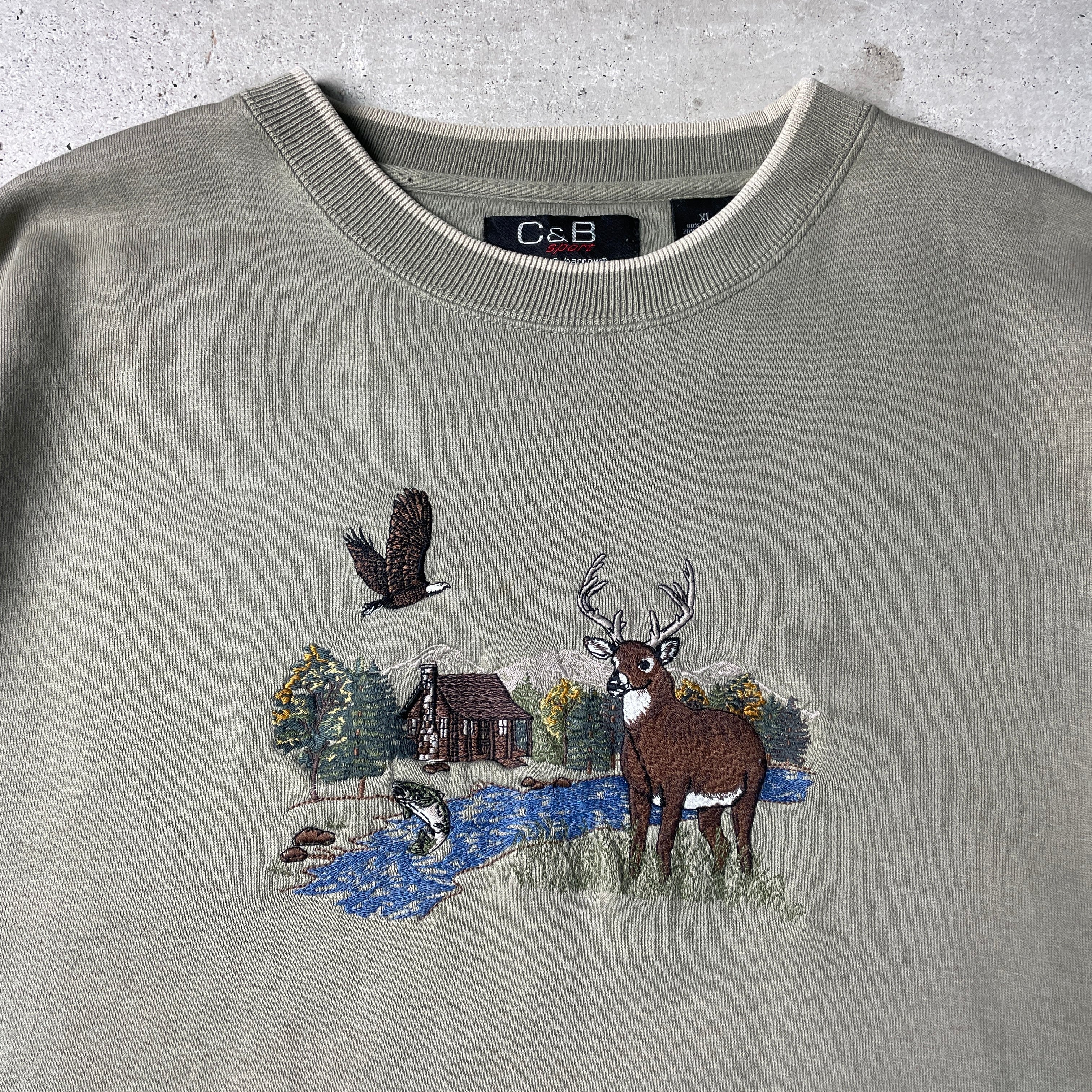 ■C&Bsport by croft&barrow 鹿 魚 鷲 アニマル刺繍 スウェットシャツ メンズXL 古着 カーキ トレーナー 【スウェット】
