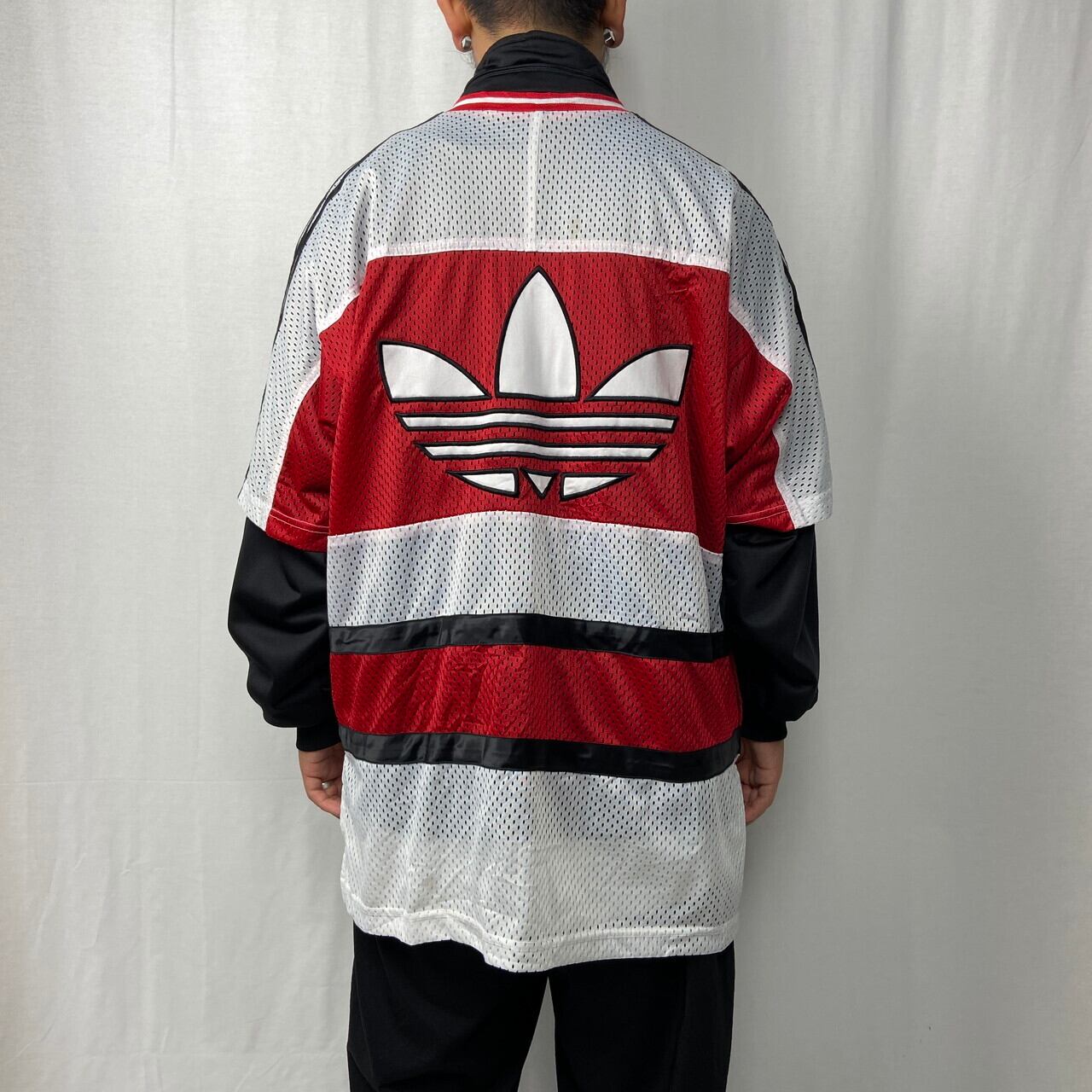 ■90年代 adidas アディダス ドッキング フェイクレイヤード メッシュ×ジャージ トラックジャケット メンズL相当 古着 90s ヴィンテージ ビンテージ レッド ブラック 赤色 黒 トレフォイルロゴ刺繍 サイドライン ゲームシャツ【ジャージ・トラックジャケット】
