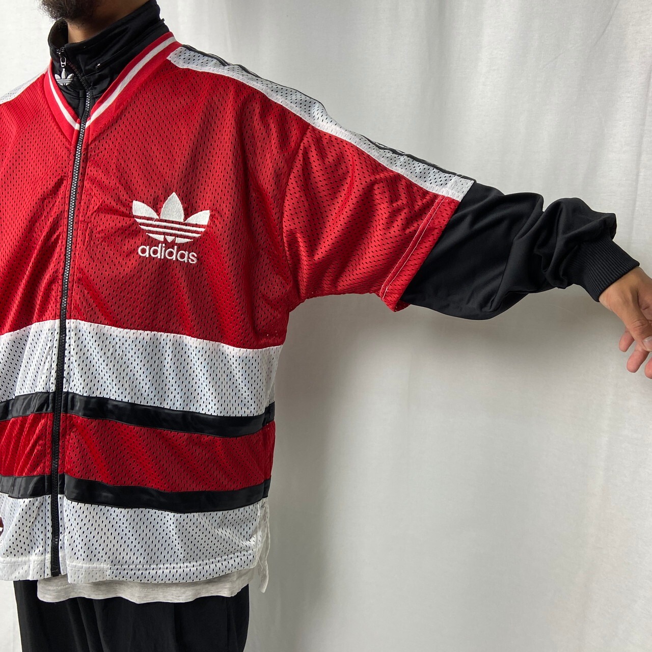90年代 adidas アディダス ドッキング フェイクレイヤード メッシュ×ジャージ トラックジャケット メンズL相当 古着 90s ヴィンテージ ビンテージ レッド ブラック 赤色 黒 トレフォイルロゴ刺繍 サイドライン ゲームシャツ【ジャージ・トラックジャケット】【SS2407-30a】