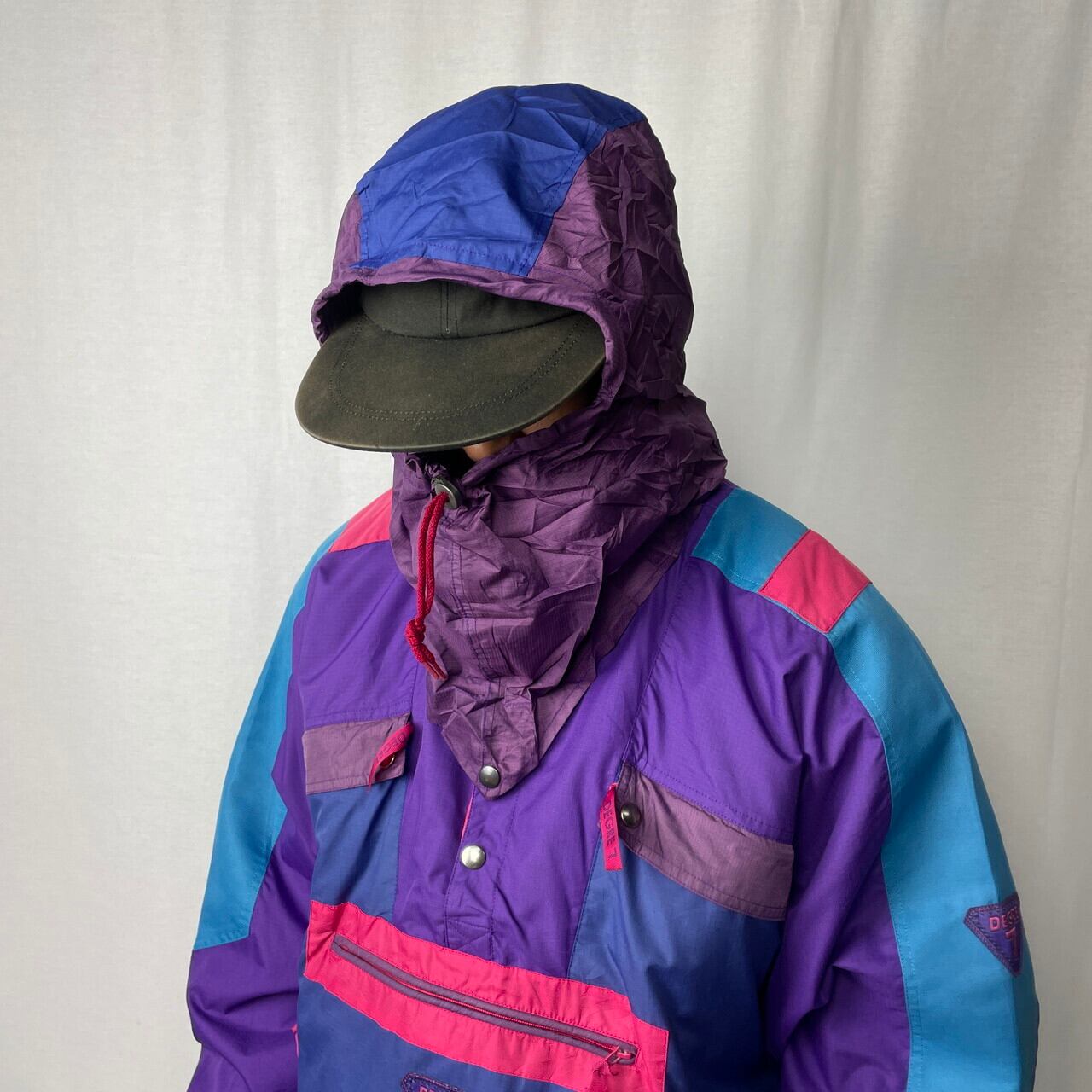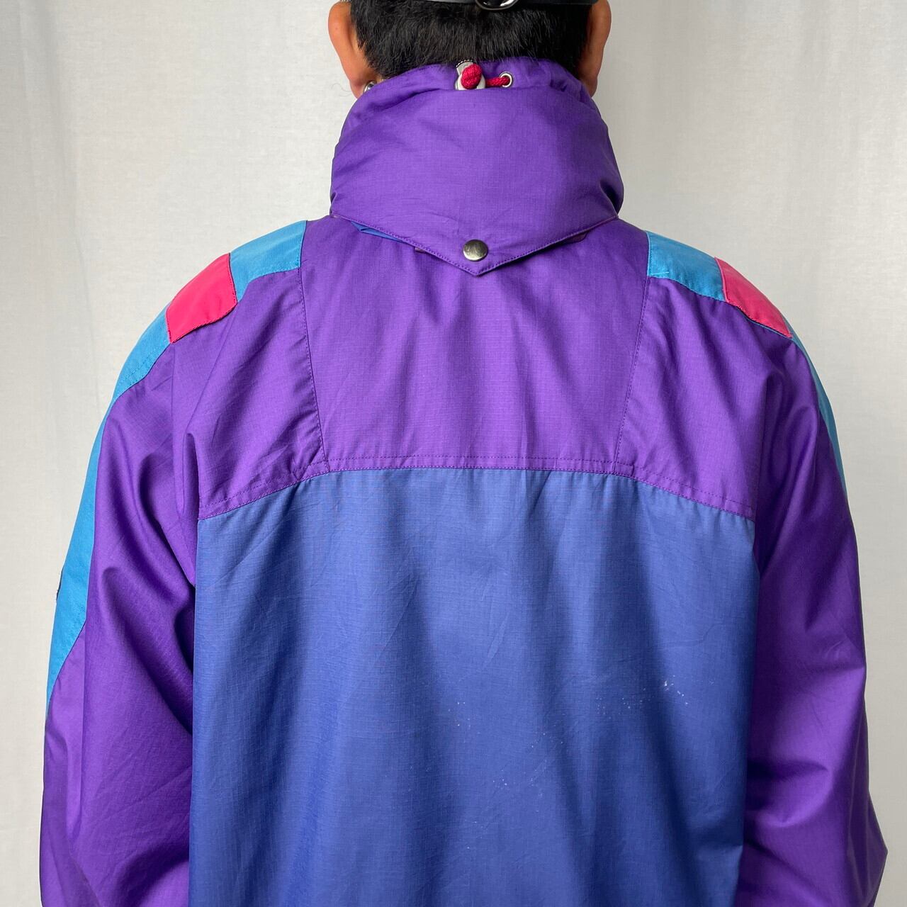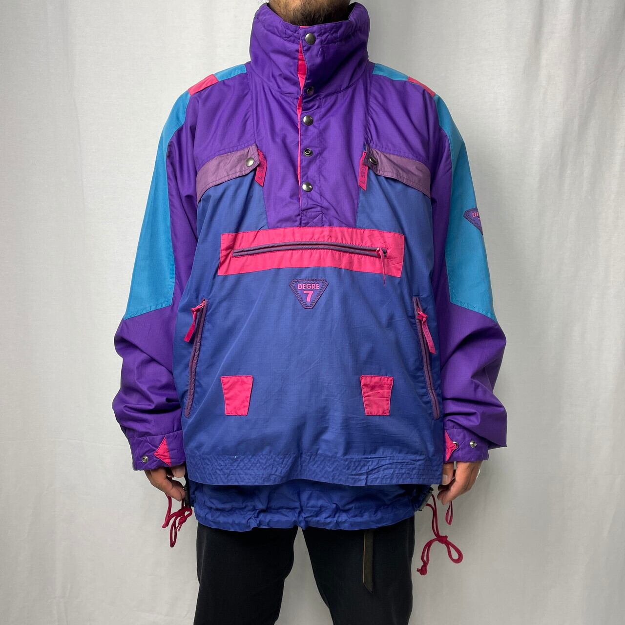 90年代 DEGRE 7 ナイロンジャケット スキージャケット メンズXL相当 古着 90s アノラック 切り替えデザイン リップストップ ヴィンテージ マルチカラー フード収納型 パープル ライトブルー ピンク ネイビー 紫色 水色 紺色【アウトドアジャケット】