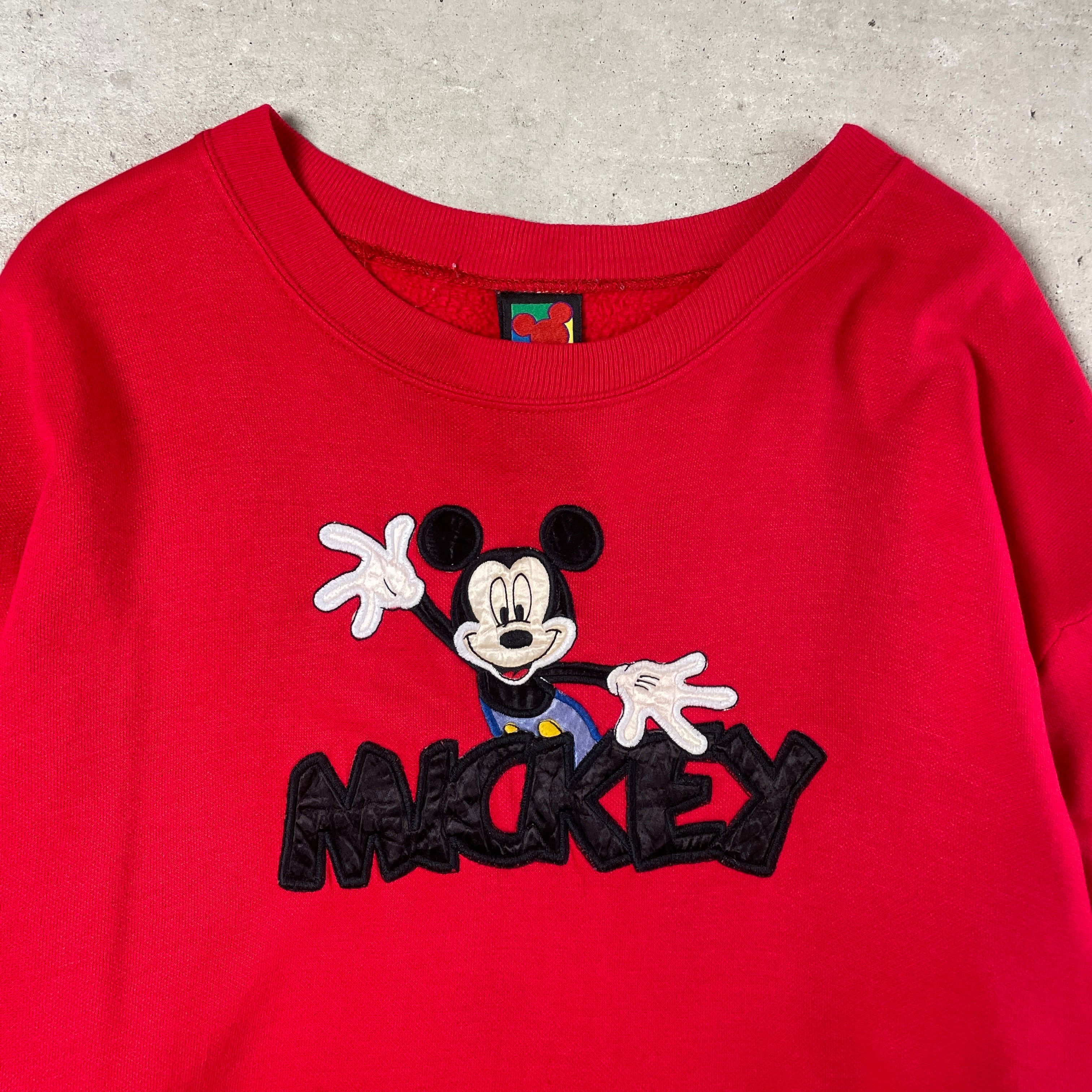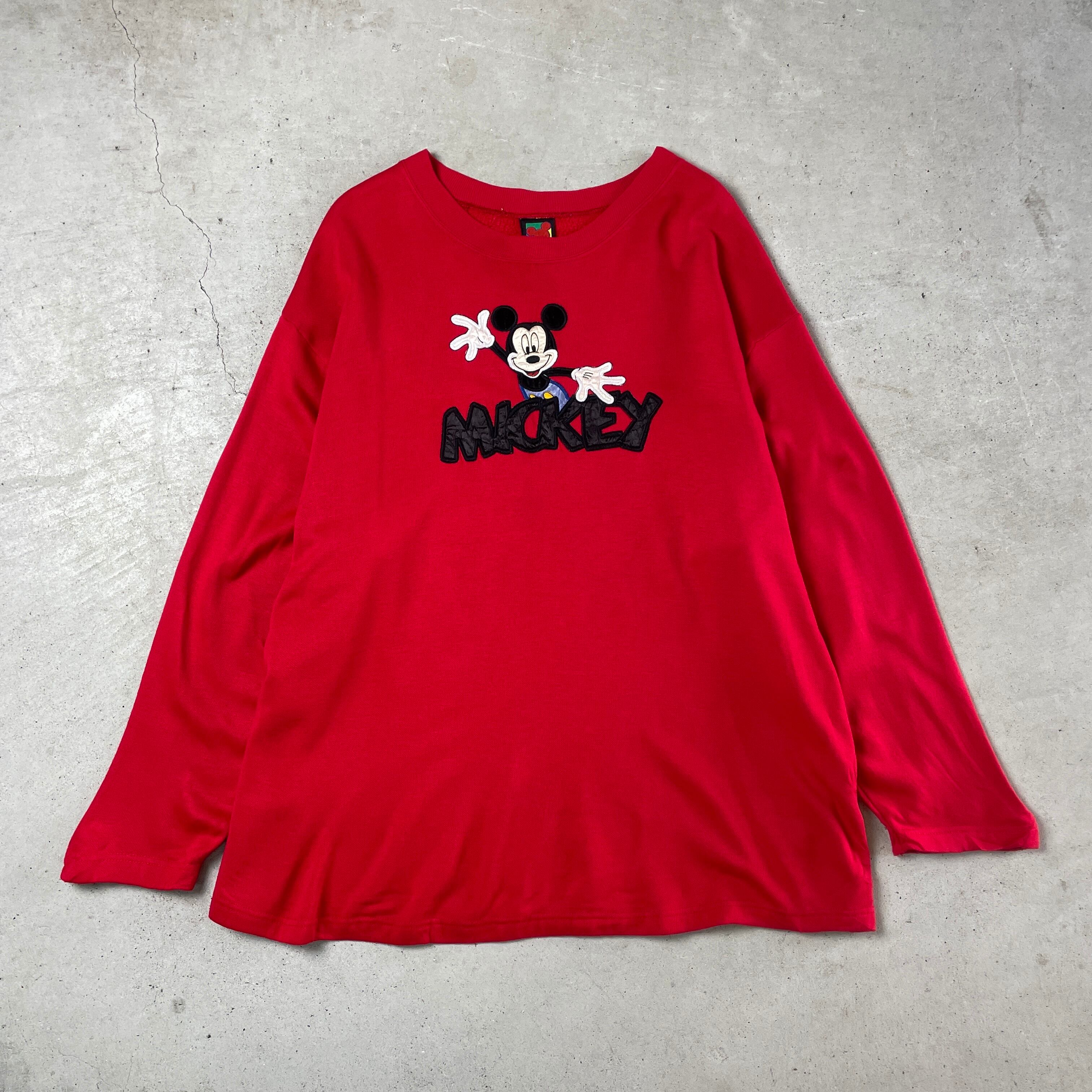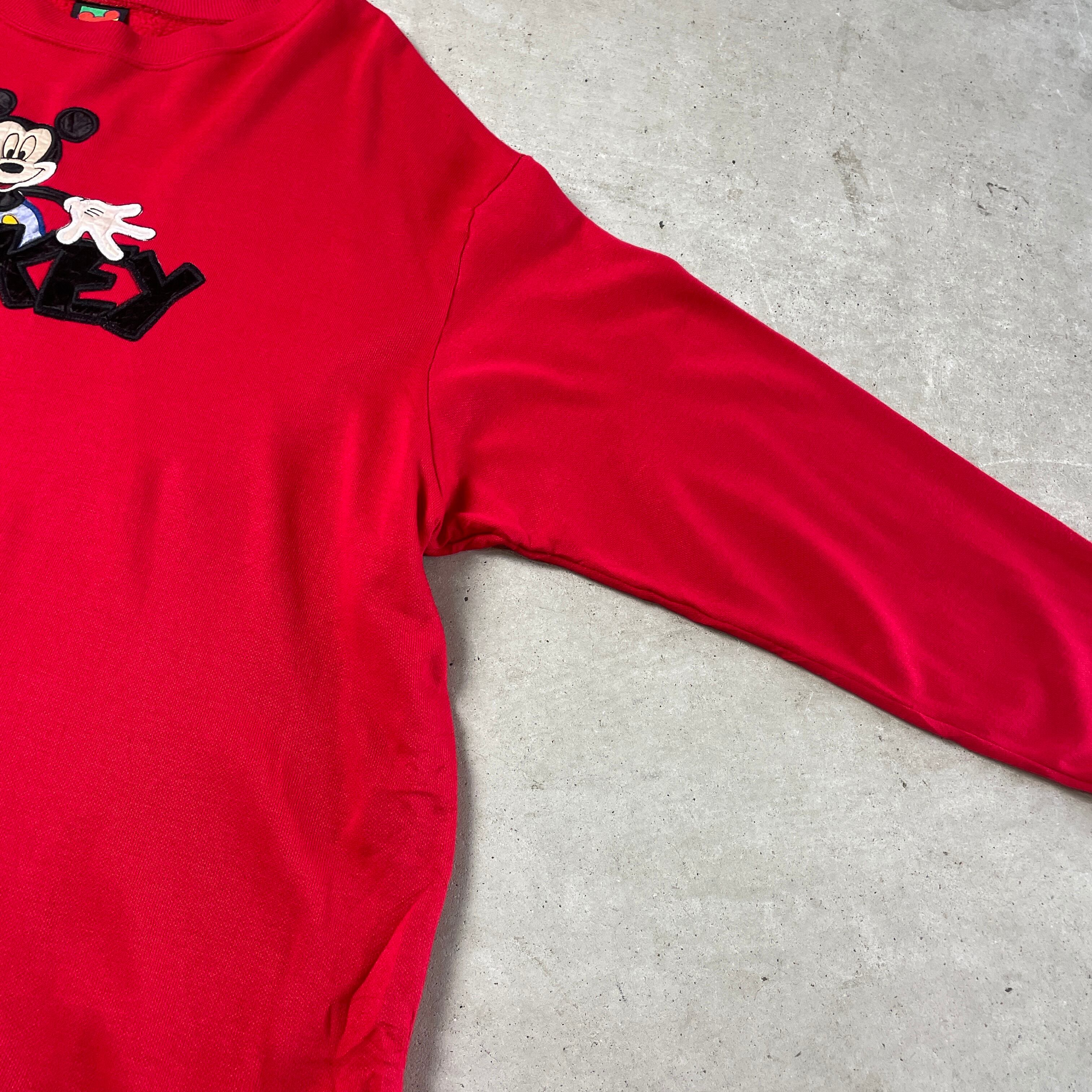 90年代 ディズニー ミッキーマウス スウェットシャツ キャラクター 刺繍 ワッペン メンズXXL相当 古着 90s ビンテージ ヴィンテージ MICKEY UNLIMITED トレーナー レッド 赤【スウェット】