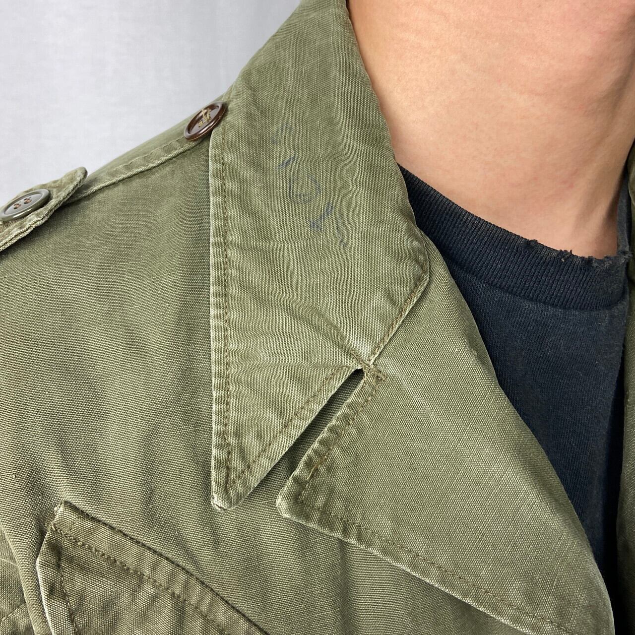 【状態】色褪せ、数ヶ所汚れ、ボタン交換、襟元にペン跡等の使用感がございます。