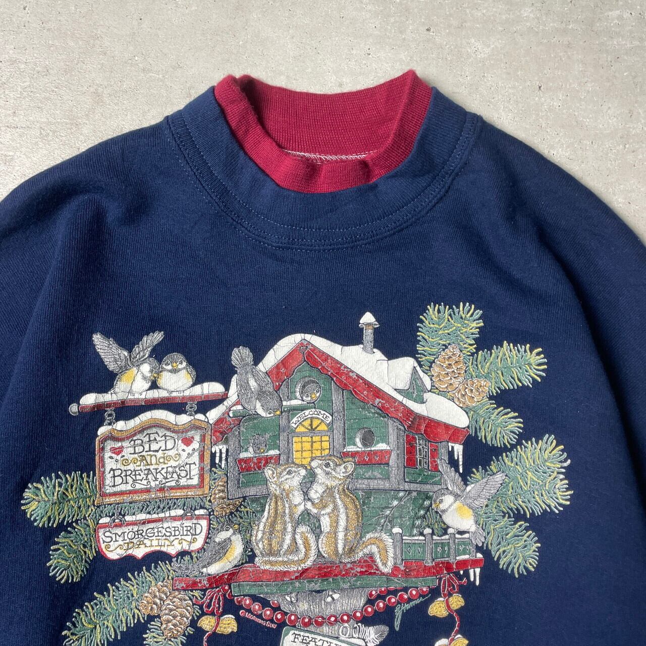 90年代 USA製 MORNING SUN スウェットシャツ アニマル レディースL 古着 90s リス クリスマス ヴィンテージ VINTAGE フェイクレイヤード ネイビー 紺色【スウェット】/ネイビー
