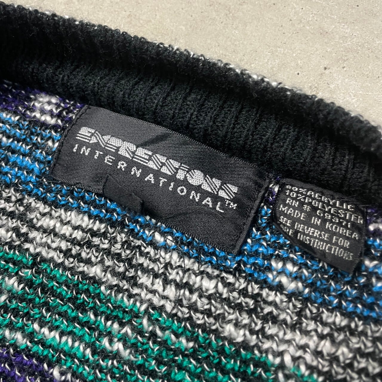 EXPRESSIONS アクリルニットカーディガン 総柄ニット メンズL 古着 ホワイト ブラック ライトブルー パープル グリーン 白 黒 水色 紫色 緑色 【ニットセーター】/マルチカラー