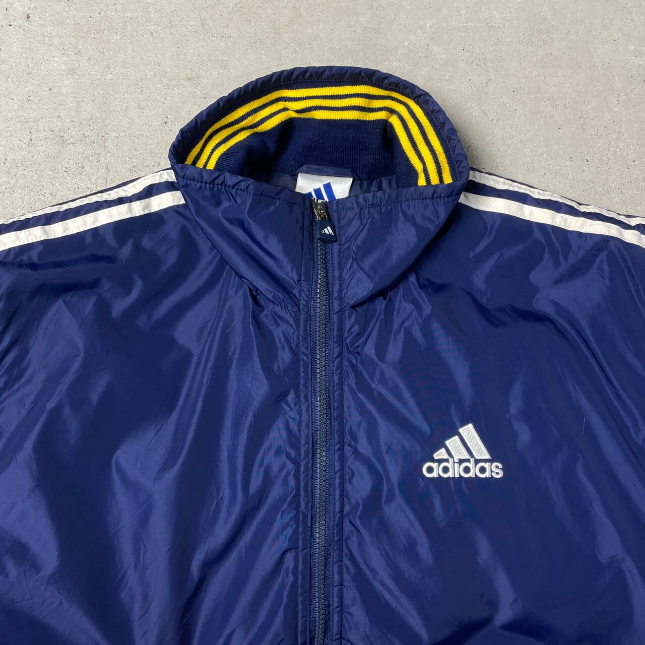 90年代 adidas アディダス 中綿入り ナイロンジャケット メンズL相当 古着 90s VINTAGE ヴィンテージ パフォーマンスロゴ 刺繍 中綿 ネイビー 紺 イエロー 黄色 ホワイト 白【ナイロンジャケット】/ネイビー【BS25-30】