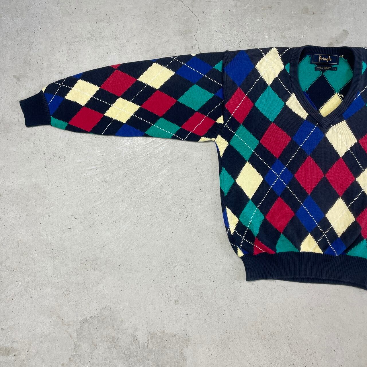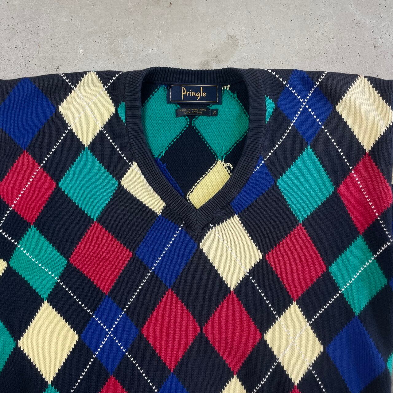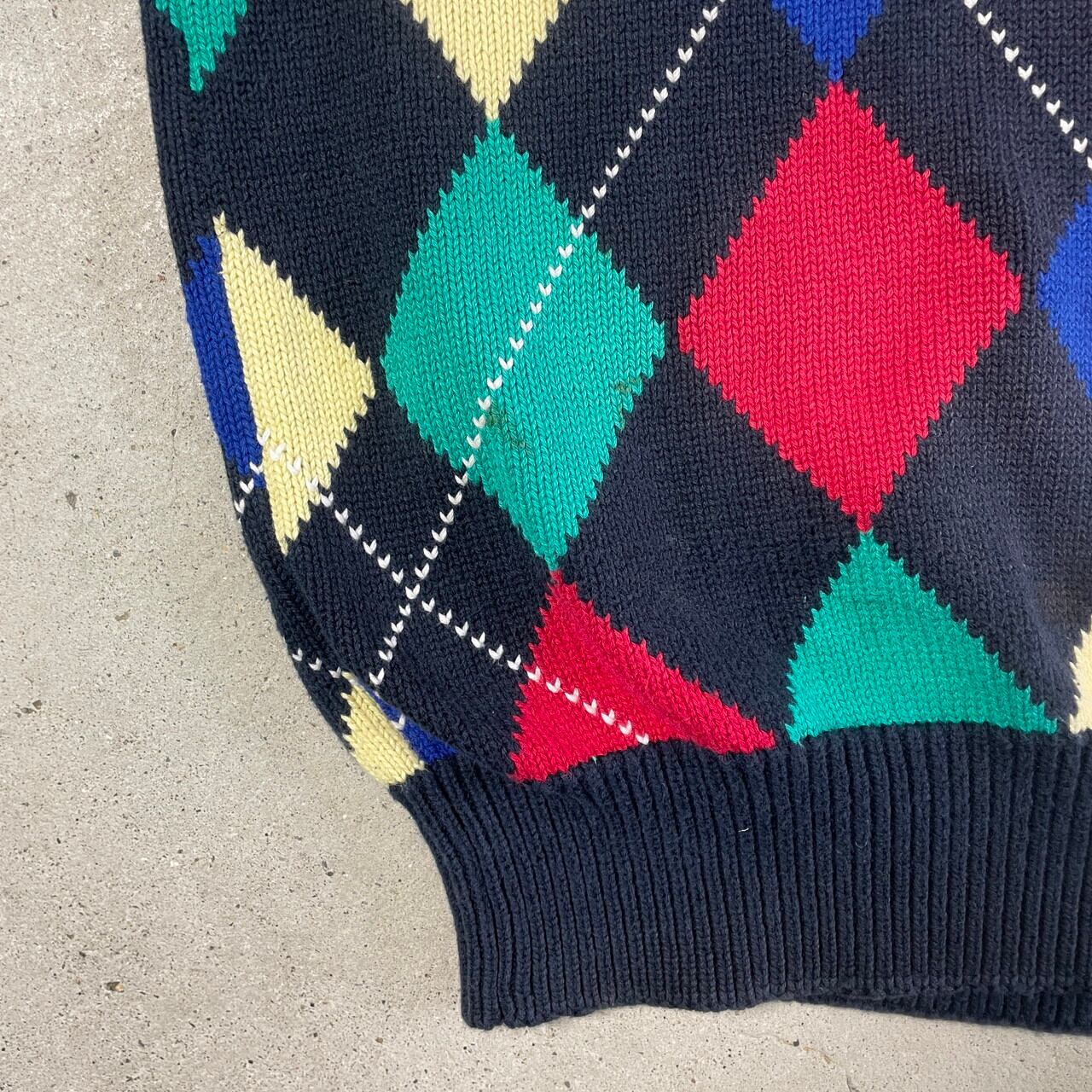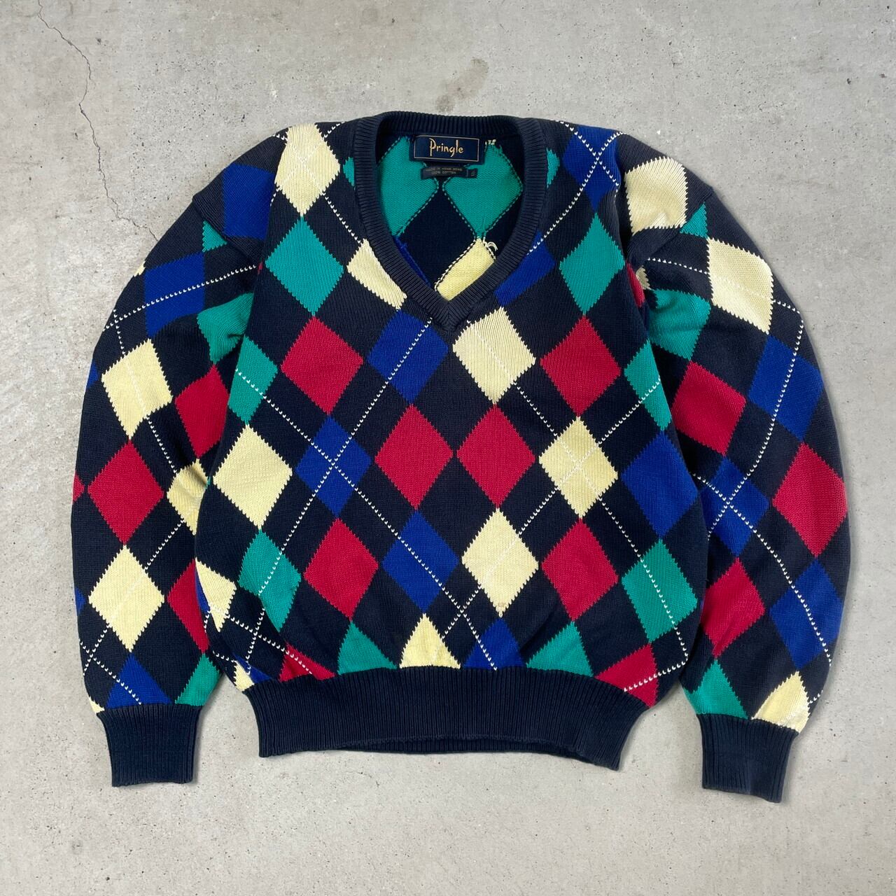 ■Pringle アーガイルチェック 総柄 Vネック コットンニットセーター メンズM-L相当 古着 ネイビー イエロー レッド ブルー グリーン 紺色 黄色 赤色 青色 緑色【ニットセーター】/マルチカラー
