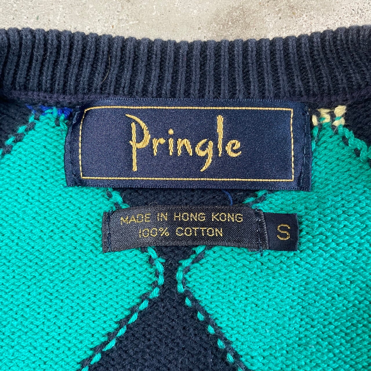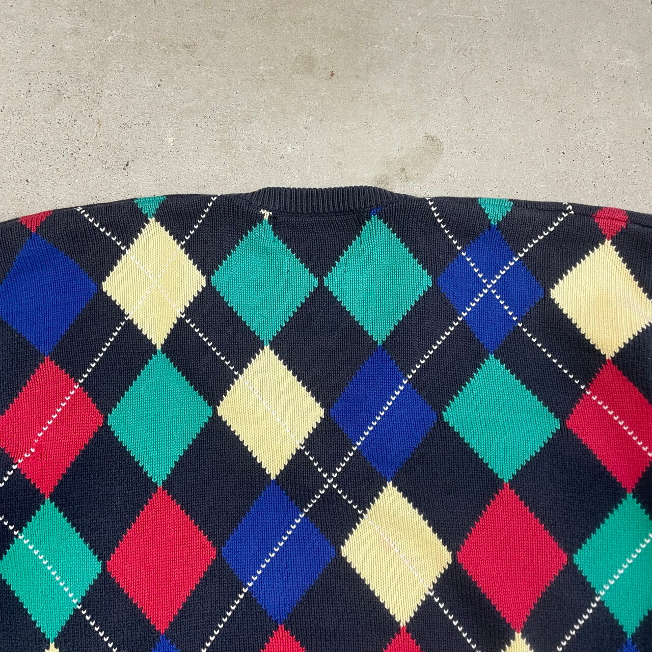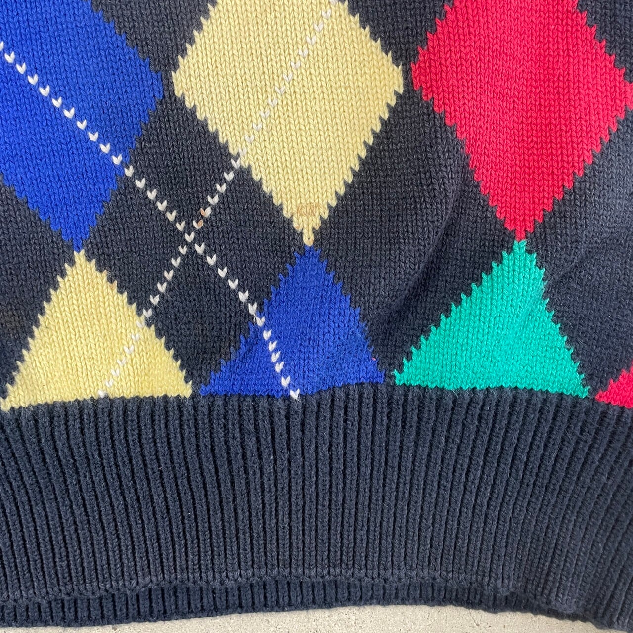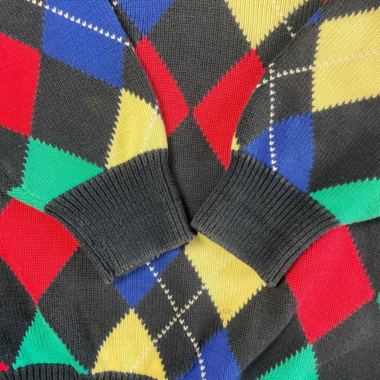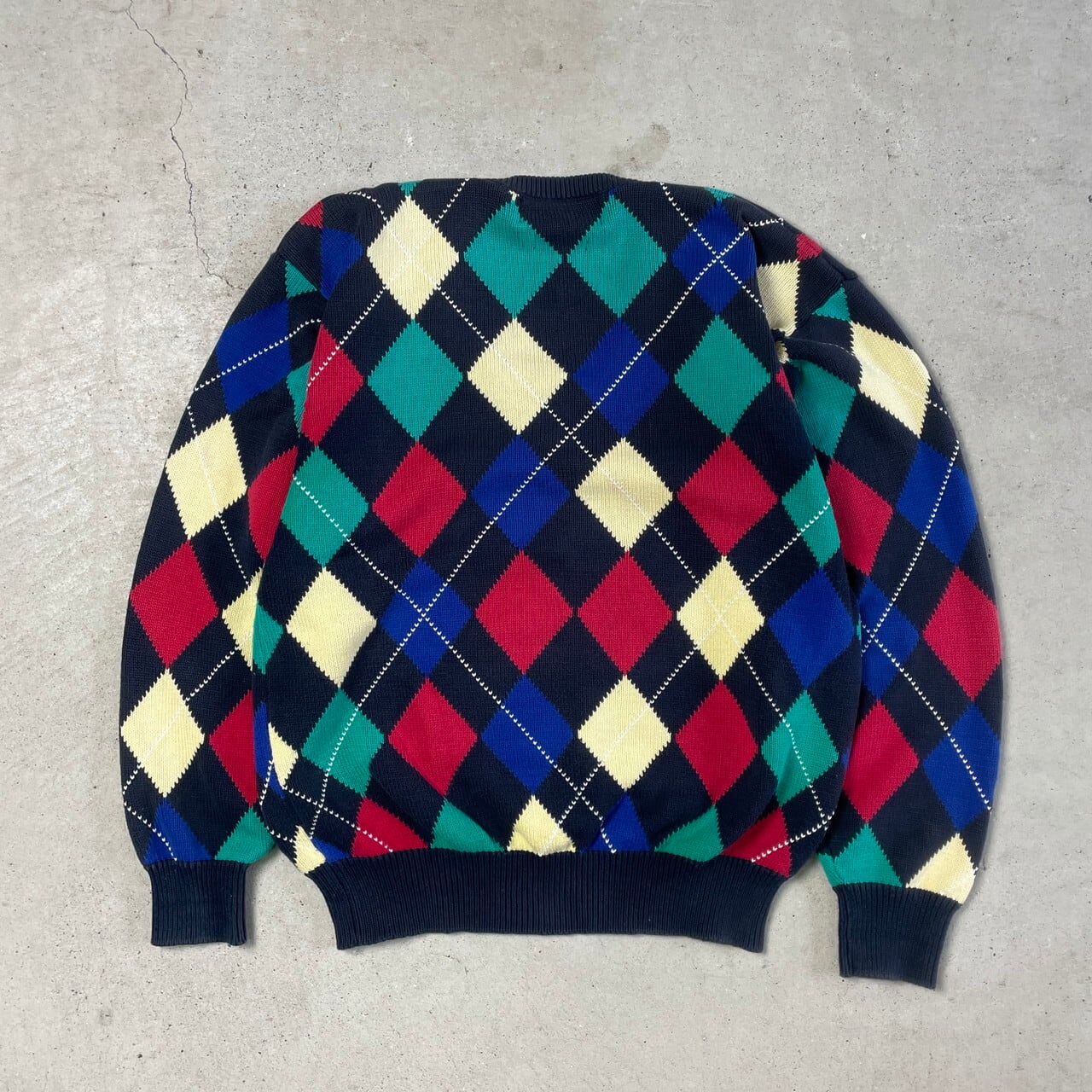 ■Pringle アーガイルチェック 総柄 Vネック コットンニットセーター メンズM-L相当 古着 ネイビー イエロー レッド ブルー グリーン 紺色 黄色 赤色 青色 緑色【ニットセーター】/マルチカラー